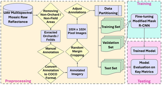 The acquired images were orthorectified and mosaicked using Pix4D photogrammetry software (Pix4D SA, Prilly, Switzerland). The resulting mosaics were processed using a methodology which has three main steps: Preprocessing, Model Training, and Evaluation (Figure 2).