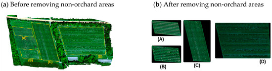 A non-orchard area removal step is introduced during preprocessing, given that the study’s objective was to assess orchard tree health on a UAV mosaic. Indeed, the UAV mosaic has portions of the landscape outside the orchards, such as roads or surrounding natural vegetation, or other crops. These irrelevant zones can dilute the model’s ability to learn features specific to apple orchards. In ArcGIS Pro, the orchard areas were manually delineated using “Polygon construction” and extracted using the “Extract by Mask” tool. Figure 3a shows the apple orchard UAV mosaic before removing non-orchard or non-field areas, and Figure 3b shows the cropped imagery showing only the four orchards.