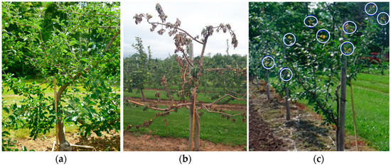 Ground pictures of apple trees. (a) Healthy tree. (b,c) Unhealthy tree. The unhealthy trees have some yellow and brown leaves (marked by white circles in (c)), indicating stress symptoms.