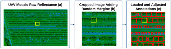 Random margin cropping procedure over a UAV apple orchard imagery. (a) RGB composite of the UAV mosaic over Orchard D. The yellow box represents a specific tree. (b) Cropped mosaics. (c) Cropped images with the tree annotations (red boxes) and the individual located tree (yellow box).