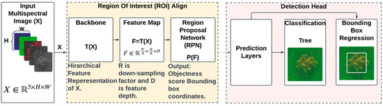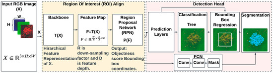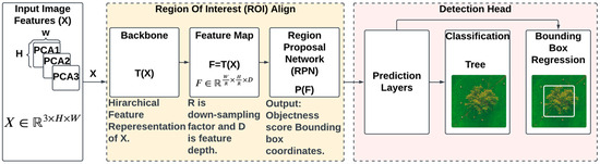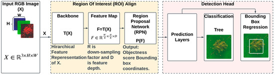 As shown in Figure 7, the baseline version uses, as an input image, an RGB image represented as X∈R3×H×W, where H and W denote the image’s height and width. The model has two components: the Region of Interest (ROI) Alignment and a Detection Head.