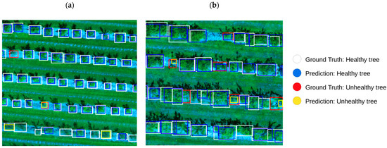 All the aforementioned studies were based on a two-step method where the tree is first identified and then its health status is determined. The trees were detected either manually, with CHM (canopy height model) or 3D fusion software to find dense point clouds [5,7,8,10,11,13,40] or using deep learning approaches [3,4]. There are a few studies that detect trees and their health status on UAV imagery using a single step (Table 3). All these studies used RGB raw reflectance images. F1-scores higher than 93% were obtained with M-CR U-NET with Overlapped Contour Separation (OVCS) in the case of oil palm trees [15] and with Faster R-CNN in the case of broadleaved trees and conifers, focusing exclusively on the detection of dead trees (trees with no leaves) [16]. The studies testing YOLOv5 had F1-scores lower than 71% with images acquired over apple trees [17], pine trees [18], and various forest tree species [19].