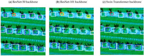 Mask R-CNN can be applied using different backbones. ResNet-50, which is the default backbone, was used by Yu et al. (2022) [24], who achieved an F1-score of 94.68% for individual forest tree crown detection on RGB images. Iqbal et al. (2021) [42] used ResNet-101 and found that deeper models improve detection and segmentation with UAV images acquired over coconut trees. They achieved an F1-score of 92% using ResNet-101 in comparison to 89% using ResNet-50. Mo et al. (2021) [43] reported that in a relatively simple binary segmentation task, ResNet-101 offered no substantial improvement over ResNet-50, with performance gains remaining below 3%. ResNeXt-101 was already used by Elharrouss et al. (2024) [44] on the MS COCO dataset—a large-scale benchmark for object detection and segmentation comprising over 200,000 labeled images from 80 categories—for object detection and achieved a mAP of 40.8% using ResNeXt-101 compared to 39.1% using ResNet-101. With this backbone, Li et al. (2023) [45] achieved an AP50 of 81.27% on the DOTA (Dataset for Object Detection in Aerial Images) aerial dataset for small object detection. On the MS COCO 2017 dataset, the Swin Transformer outperformed ResNeXt-101, achieving an AP50 of 70.9% versus 66.5% [46]. Recent studies (e.g., Jeevan et al. (2024) [47]) have even suggested that CNNs may be preferable in low-data regimes due to better fine-tuning behavior.