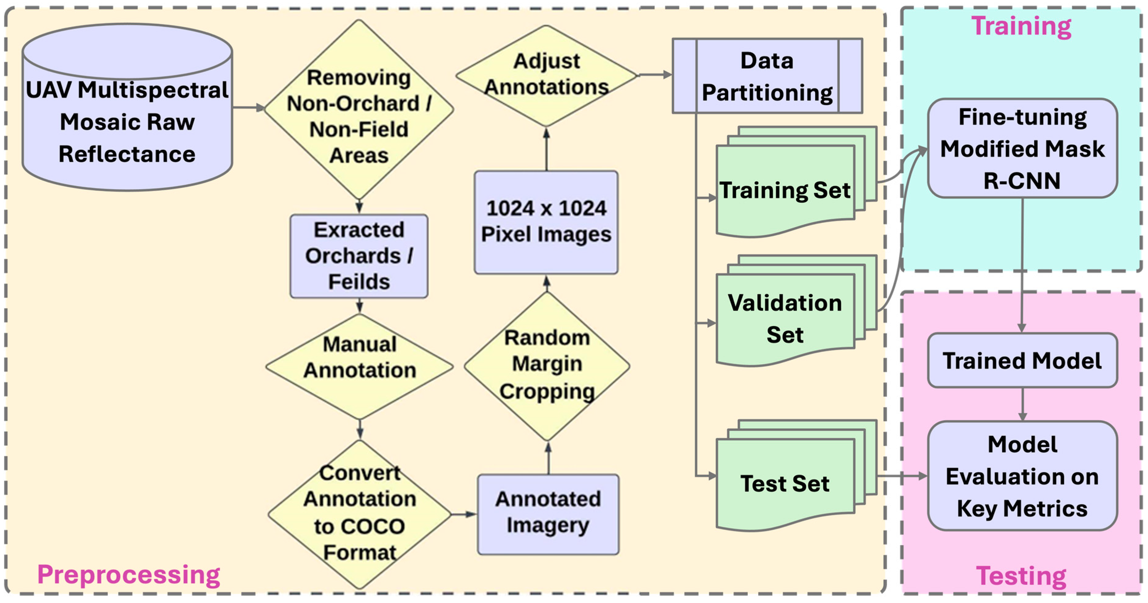 - A one-step Mask R-CNN with a ResNeXt-101 backbone on 5-band UAV multispectral imagery best distinguishes healthy vs. unhealthy apple trees (F1 = 85.70%, mIoU = 92.85%).