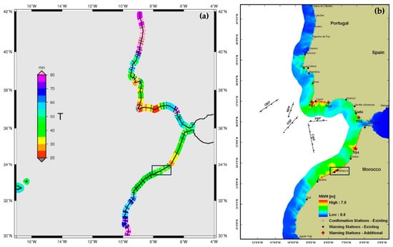 Digital maps showing (a) the minimum travel time to arrive at the shore estimated for five sources (GB, MPF, HSF, PBF, and CWF); and (b) the maximum wave height for the 5 Tsunami sources of the coastline of Casablanca, modified from Omira et al. [].