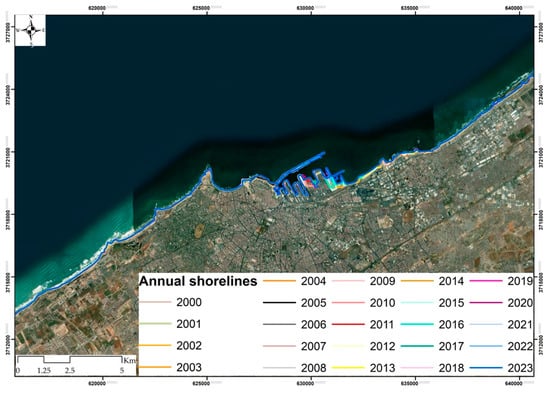 The coastline of Casablanca is subjected to a range of pressures, including extreme weather and climate, sea level rise, and human development. Understanding how this coastline responds to these pressures is important for managing this region from social, environmental, and economic perspectives. The DE Africa Coastlines products are continental datasets that include annual shorelines and coastal change rates along the entire African coastline from 2000 to 2023. These products combine satellite data from the DE Africa program with tidal modeling to map each year’s typical coastline location at mean sea level. Based on a tidal mode, the mapped shoreline corresponds to the median waterline position at approximately 0 m above mean sea level. The products enable coastal erosion and growth trends to be examined annually at both a local and continental scale, and for patterns of coastal change to be mapped historically and updated regularly as data continue to be acquired. The ability to map shoreline positions for each year provides valuable insights into whether changes to the coastline resulting from particular events or actions, or a process of more gradual change over time [,]. Such analyses were conducted in this study. A database of annual shorelines (Figure 4) and 1630 points of those products was created and analyzed in ArcGIS.