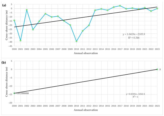 Illustrations of LRR and EPR calculations using annual shoreline distances. This illustration is an example of the measured point 0 located on the coast of Casablanca, Morocco (the beach at the Zenata segment). (a) LRR is calculated by considering all cross-shore annual shoreline positions where the slope of the equation equals the rate of change (1.0419 m/yr). (b) EPR is calculated by considering cross-shore positions of the oldest annual shoreline (2000) and most recent annual shoreline (2023) where the slope of the equation equals the rate of change (0.6191 m/yr). Detailed descriptions of this point considered for LLR and EPR calculations are presented in Supplementary Materials S.1 (Table S1).