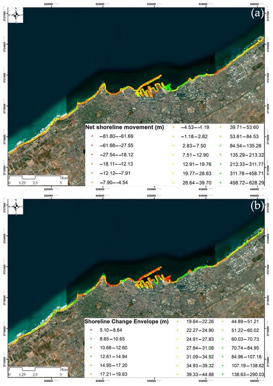 Annual rates of change for 1630 points located on the coast of Casablanca. LRR revealed the coastline growth reaching 16 m/yr and the retreat of about −4 m/yr near the port of Casablanca (a), while EPR indicated the coastline growth of about 28 m/yr and a retreat of about −3 m/yr (b). Information related to the significance (p-value) and the standard error of the linear relationship between the annual shoreline cross-shore positions and the annual observations is presented in Supplementary Materials S.3 and S.4 (Figures S2 and S3).