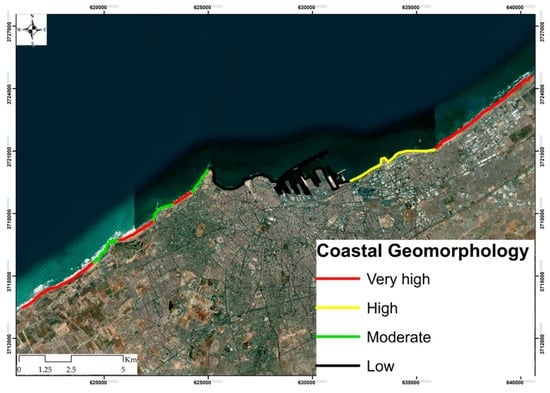 In this study, the CVI was calculated to assess the vulnerability of the Moroccan Atlantic Coast in Casablanca. The CVI was analyzed using remote-sensing and GIS techniques, namely the DE Africa Coastlines products and ASTER GDEM, as well as a geological map in a GIS environment. The CVI was calculated based on four variables (coastal elevation, coastal slope, coastal geomorphology–lithology, and shoreline dynamics). Figure 7 depicts the vulnerability of the coast of Casablanca based on its geomorphology. Very high vulnerability was observed in areas occupied by sandy beaches in the NE and SW of Casablanca, while high and moderate vulnerability were observed on natural and semi-natural coasts occupied by hard rocks.