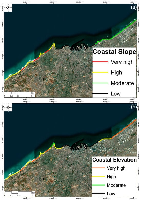 Rankings of variables used to calculate the Coastal Vulnerability Index: (a) coastal slope and (b) coastal elevation.