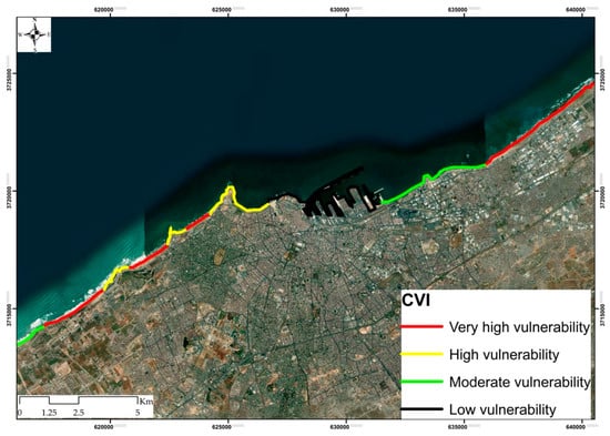 Information obtained from different coastal variables, such as coastal geomorphology–lithology, coastal slope, shoreline dynamics (erosion/accretion), and coastal elevation, were used to compute the CVI using Equation (4), which integrates all of these variables (Table 2). While it is well known that there is no universally fixed equation for calculating CVI, methodological approaches are typically adapted to the specific morphological characteristics of the study area, such as surface features, geological settings, and local coastal processes. The four variables in this study were selected based on their physical relevance to coastal vulnerability and their frequent application in previous CVI frameworks. These parameters have consistently been identified in the literature as key indicators of coastal risk, especially in areas experiencing rapid shoreline changes and low-lying topography. Additionally, these variables were chosen based on data availability, quality, and their capacity to capture the dominant processes influencing vulnerability along the Casablanca coastline. In this study, the CVI was calculated as the geometric mean of the ranked variables. The use of the geometric mean rather than the arithmetic mean was chosen because it reduces the influence of extreme values and provides a balanced representation of the combined effect of multiple factors, which is particularly appropriate in multi-criteria assessments such as CVI. Equal weighting of the four variables was applied following a common practice in previous CVI applications, where, in the absence of a universally accepted weighting scheme, equal weighting ensures that no single factor disproportionately drives the index.