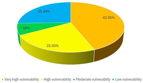 Figure 11 depicts the proportion of the CVI, indicating that 43.95% and 23.03% of the Casablanca coastline have, respectively, a very high and high vulnerability index, and they are vulnerable to natural phenomena such as inundation, coastal flooding, and submersion, while 7.58% and 25.44% have, respectively, moderate and low vulnerability. The northeast and southwest of the coastline of Casablanca are more vulnerable due to a lack of protection for areas occupied by sandy beaches, while the areas occupied by hard rocks or cliffs are less vulnerable. However, in the central part of the harbor of Casablanca, the artificial coastline is occupied by constructions and is well protected.