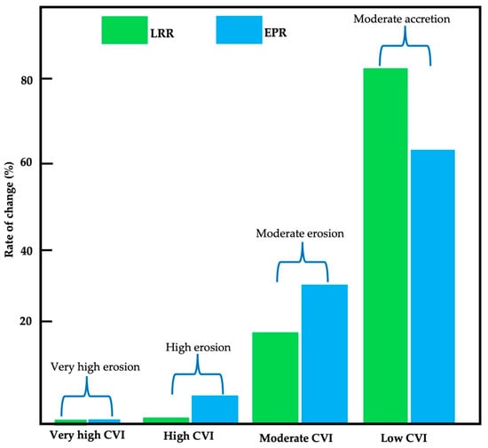 In general, the rates of change calculated for these six beaches revealed low CVI with moderate accretion at the rates of 82% and 63%, moderate CVI with moderate erosion at the rates of 17% and 34%, and high CVI with high erosion at the rates of 0.89 and 3.06 for LRR and EPR, respectively; no very high CVI was observed for LRR or EPR (Figure 12).
