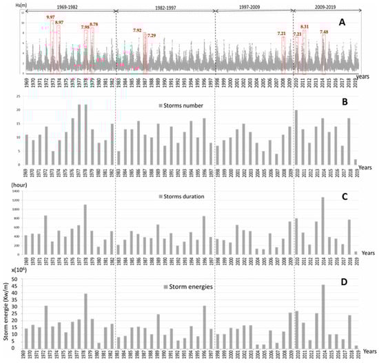 Yearly distribution of significant wave height (A), number of storms (B), storm duration (C), and storm energy (D) during the 1969–2020 period along the coastline of Casablanca–Mohammedia, modified from Chtioui et al. [].