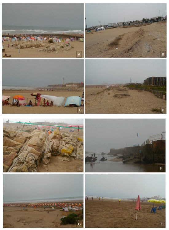 The City of Casablanca, situated on the western limit of the Moroccan coastline, has two main rivers: Beth and Bourgreg. It also has big watersheds and several dams. In addition, the coastal region is drained by small rivers such as Oued Mellah, Oued Lakhdar, Oued Dir, Oued Merzeg, Oued Arrimena, and Oued Bouskoura. Each river has its watershed with variable shapes and different characteristics. The geological formations dominating the coast of Casablanca are shale, sandstone, and quartzite; these formations constitute the folded Hercynian bedrock, which is affected by a network of faults dominating the NE-SW direction. The bedrock is visible in some coastal regions, but the rest is covered by secondary (Triassic and Cretaceous) formations and Tertiary formations dominated by limestone, and conglomerate; and Quaternary formations dominated by sand. The geomorphology of the Casablanca coast is characterized by sand beaches, rocky beaches, and artificial structures (Figure 2). In the ArcGIS software version 10.2.2, geomorphology–lithology information of the Casablanca coastline was obtained using visual interpretation and manual digitization approaches from geological maps and historical data [].
