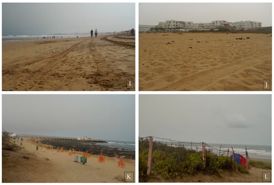 Casablanca coastline landscape features obtained from field observations conducted on 6 August 2015. The coastline field documentation was performed by taking photographs of geologic formation (A,E,K), instantaneous shoreline (F), urban extension (B,D,F,J), beach composition (I), and beach stabilizations (L) and utilization (C,G,H). Information obtained was later used for interpretation and the validation of remote-sensing results. These photographs were taken on the beach of the Anfa segment (A–D), on the neach of the La Corniche segment (E–H), and on the Beach of the Ain Diab segment (I–L).