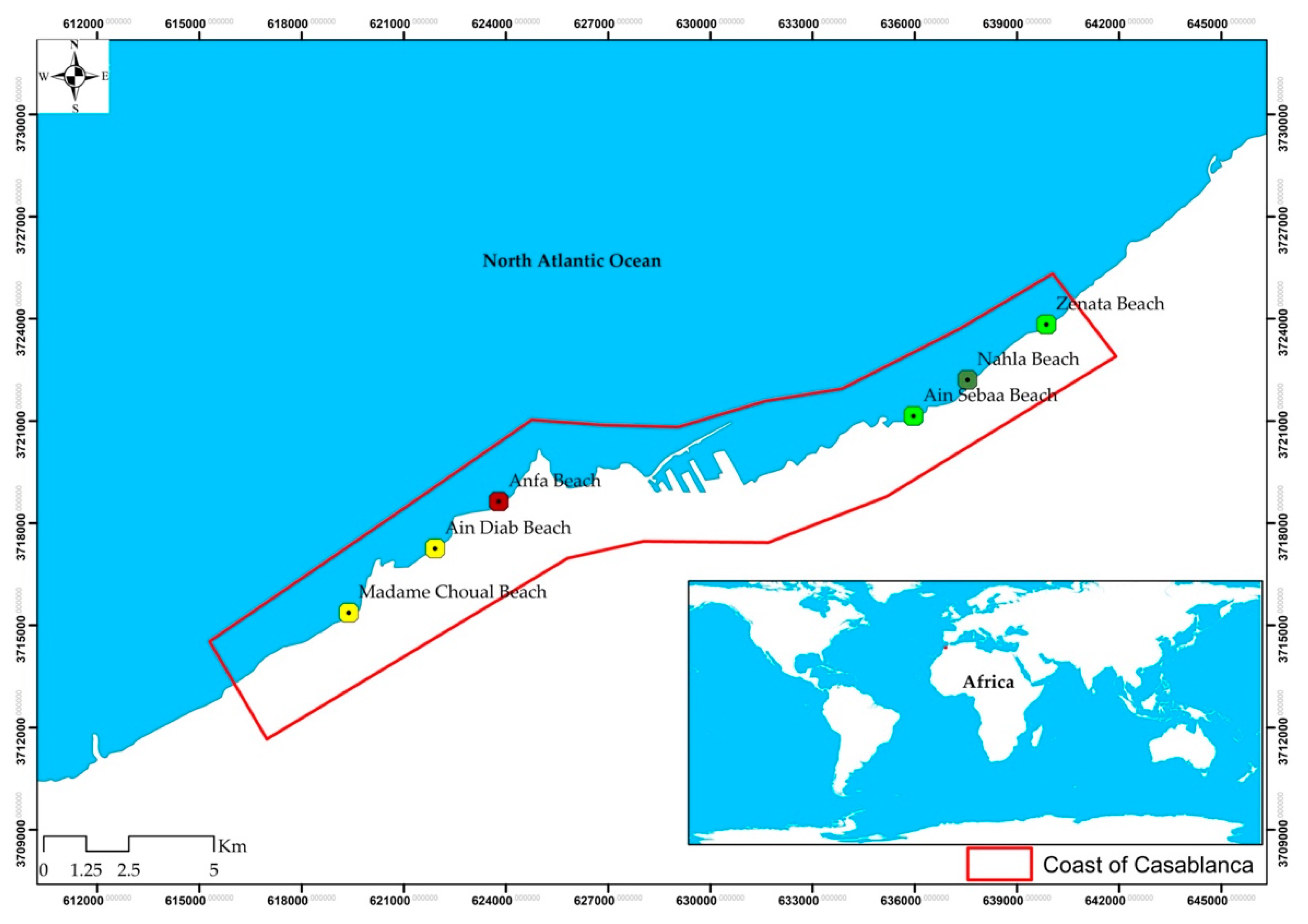 - Oussama, L. Approche Multidisciplinaire de Suivi de la Dynamique Marine du Littoral de Mohammedia. Master’s Thesis, Université Cadi Ayyad, Marrakesh, Morocco, 2013; pp. 24–25. [Google Scholar]