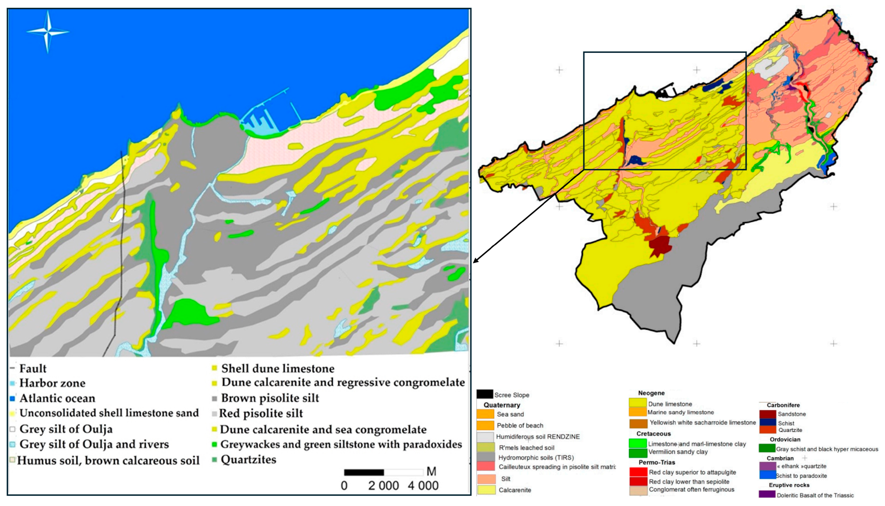 - Egis bceom international/iau-idf/brgm. Adaptation au Changement Climatique et aux Désastres Naturels des villes Côtières D’afrique du Nord, Phase 1: Évaluation des Risques en Situation Actuelle et à L’horizon 2030 pour la ville de Casablanca Version finale; World Bank: Washington, DC, USA, 2011; pp. 17–25, 33–52, 70–80. [Google Scholar]