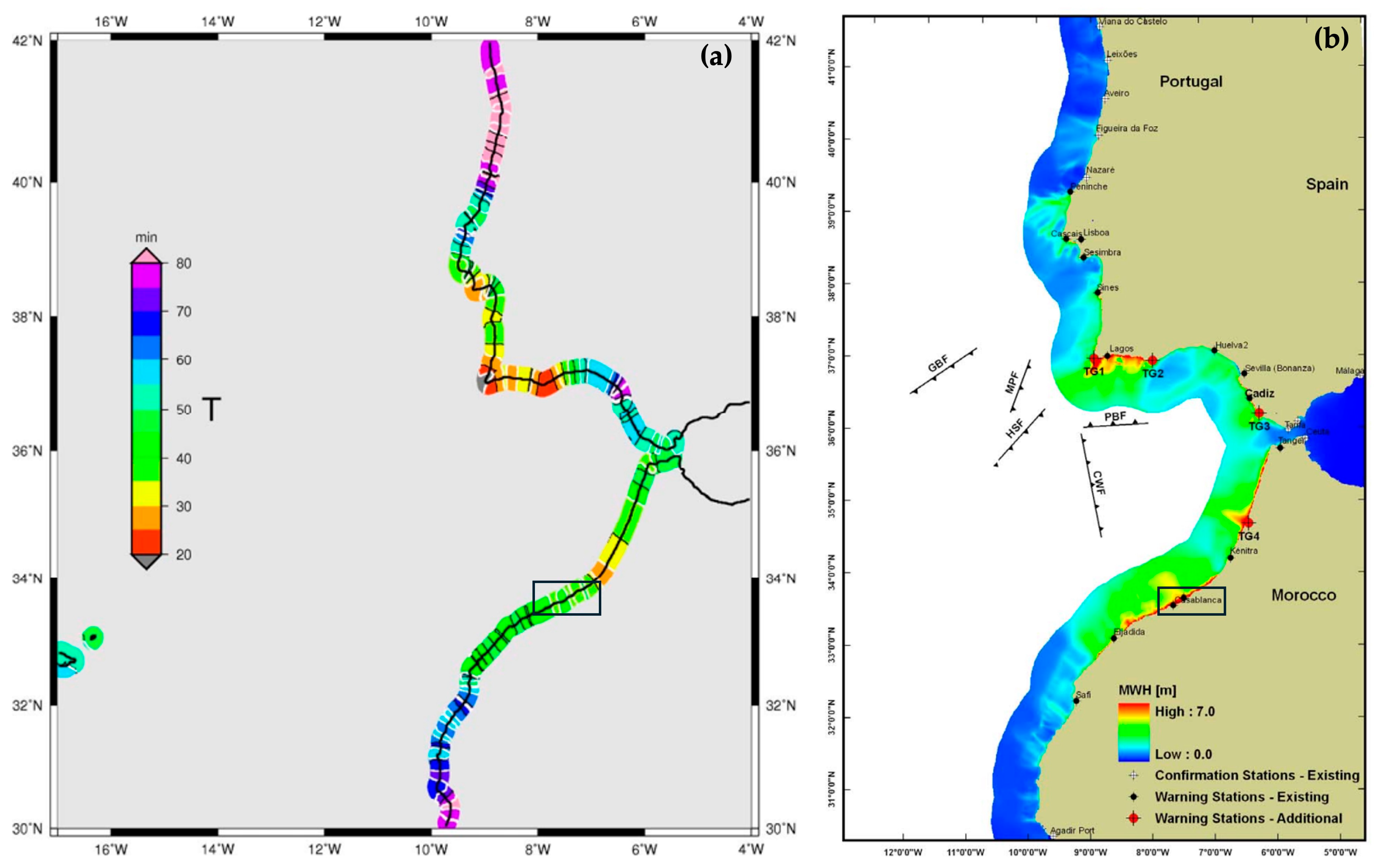 - Omira, R.; Baptista, M.A.; Matias, L.; Miranda, J.M.; Catita, C.; Carrilho, F.; Toto, E. Design of a Sea-level Tsunami Detection Network for the Gulf of Cadiz. Nat. Hazards Earth Syst. Sci. 2009, 9, 1327–1338. [Google Scholar] [CrossRef]