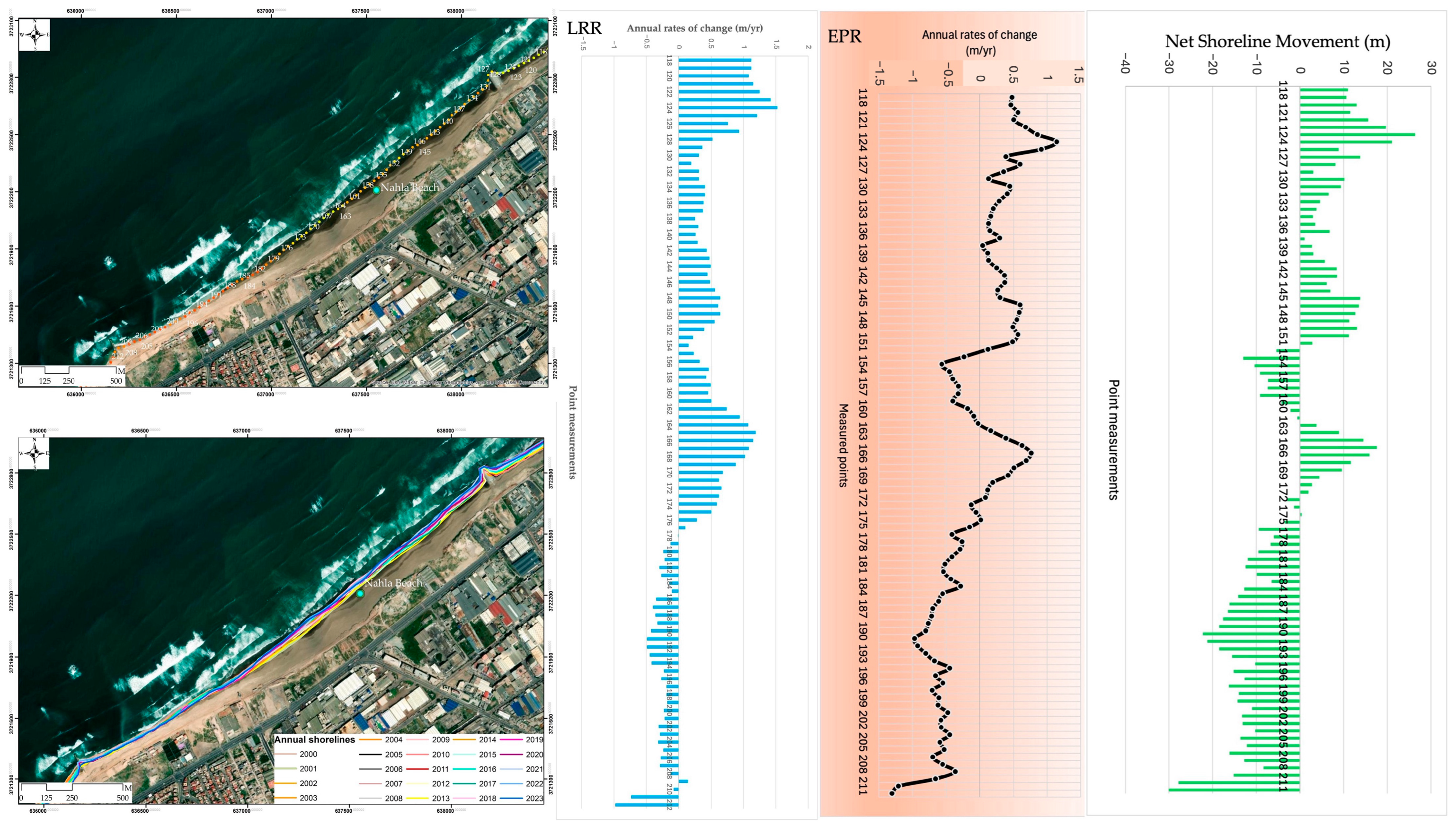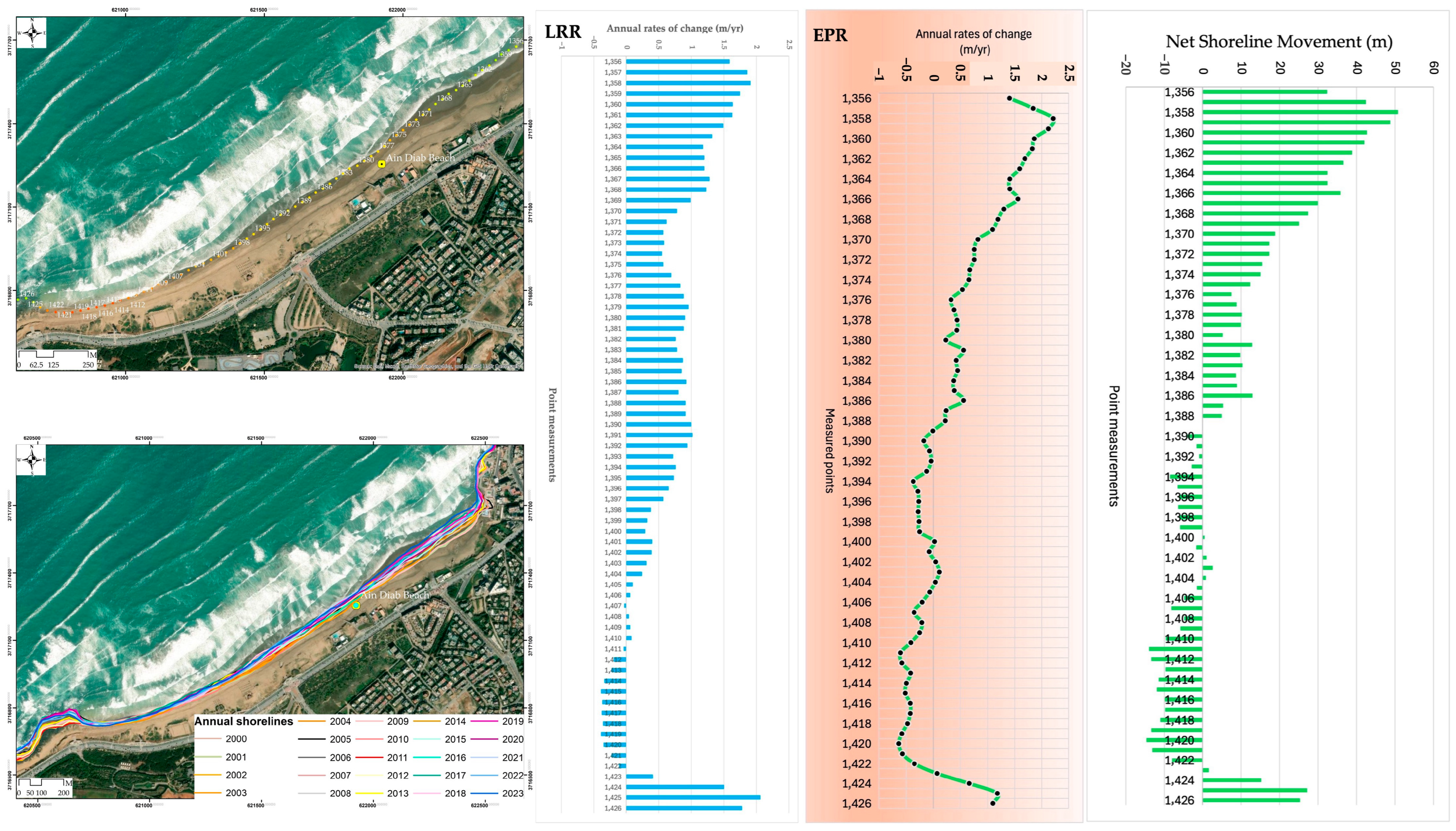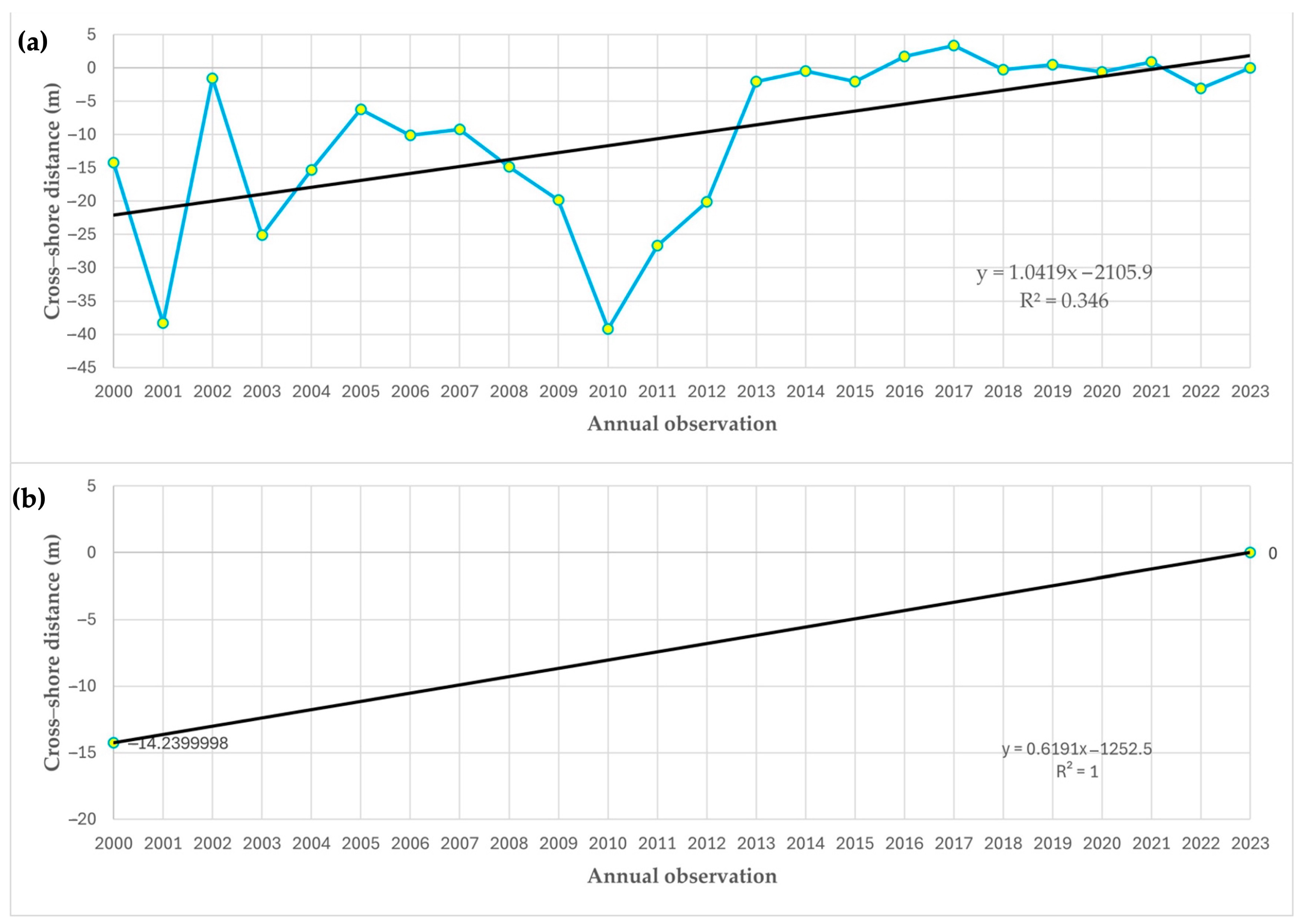 - Benkhattab, F.Z.; Hakkou, M.; Bagdanavičiūtė, I.; Mrini, A.E.; Zagaoui, H.; Rhinane, H.; Maanan, M. Spatial–temporal analysis of the shoreline change rate using automatic computation and geospatial tools along the Tetouan coast in Morocco. Nat. Hazards 2020, 104, 519–536. [Google Scholar] [CrossRef]