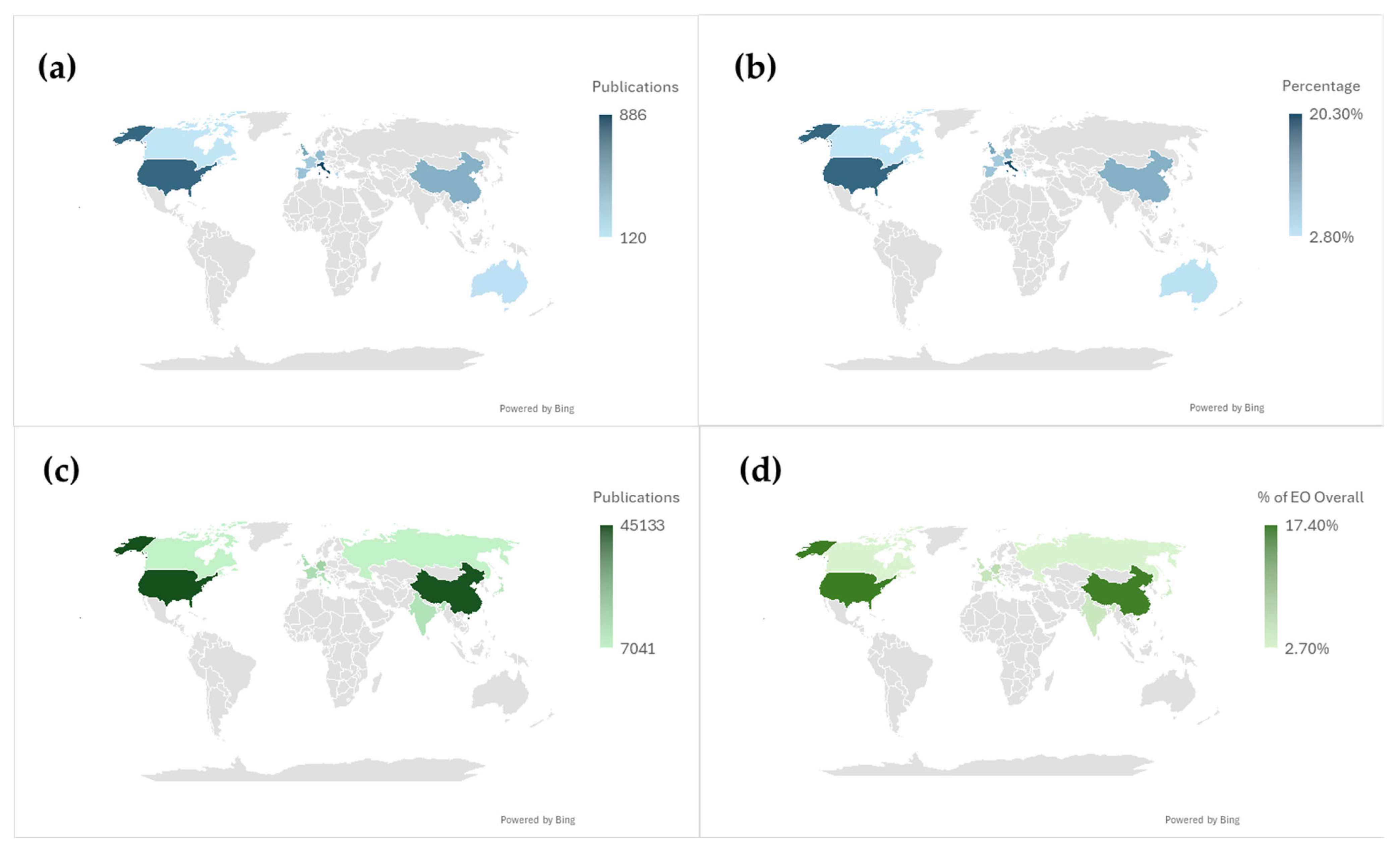 Figure 2. A map visualizing the temporal distribution and growth analysis (2000–2025). Publications related to Earth observation and archaeology: (a) the number of publications per country, (b) the percentage of publications per country, (c) the total number of Earth observation publications per country, and (d) the percentage distribution of Earth observation publications per country.