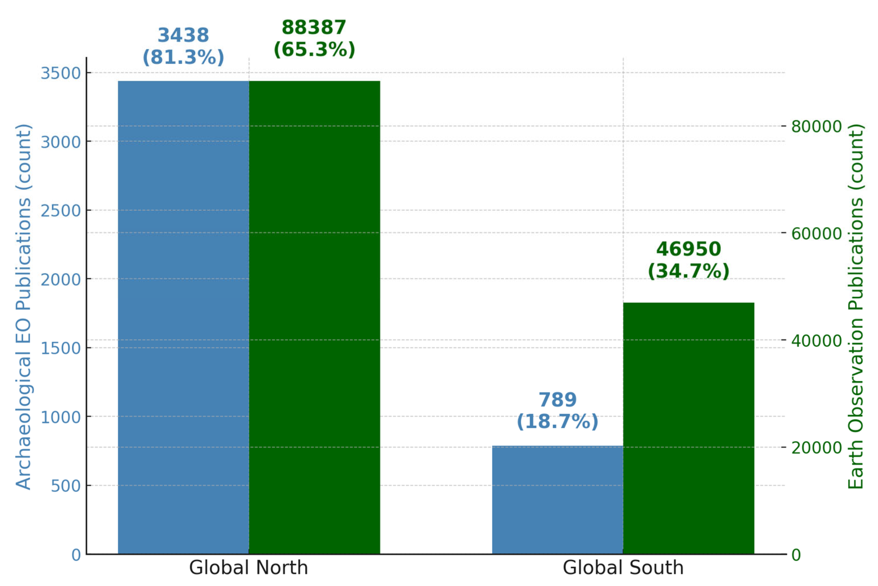 This situates archaeological Earth observation within its disciplinary context and reveals that the under-representation of the South is not merely a reflection of global publication asymmetries but is amplified in the archaeological subfield. Whereas the broader EO domain demonstrates a gradual narrowing of the North–South gap, archaeological EO exhibits a more entrenched imbalance. This finding underscores that the issue is not simply the expected predominance of the North in scientific production but a disproportionate exclusion of the Global South from a field directly relevant to its cultural and archaeological heritage.