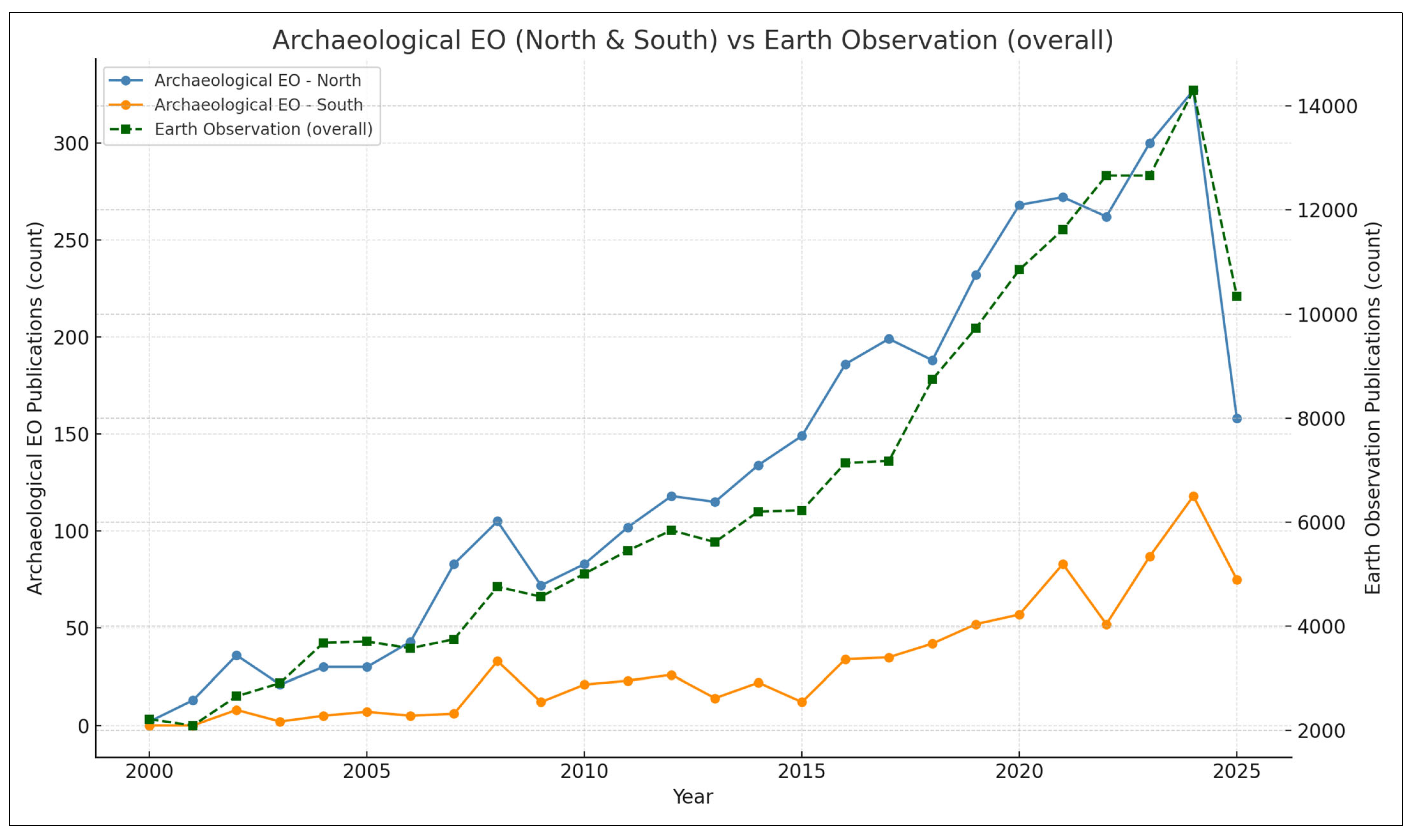This systematic review of 4359 unique publications spanning 25 years documents both extraordinary growth and profound geographic disparities in archaeological remote sensing. Quantitatively, 47.2% of all output appears in 2020–2025, while 78.9% originates from North institutions—even though the Global South hosts 51.7% of UNESCO World Heritage Sites (the Global North hosts 48.3%). At the same time, the overall trend of the scientific field of Earth observation was studied for comparison purposes.