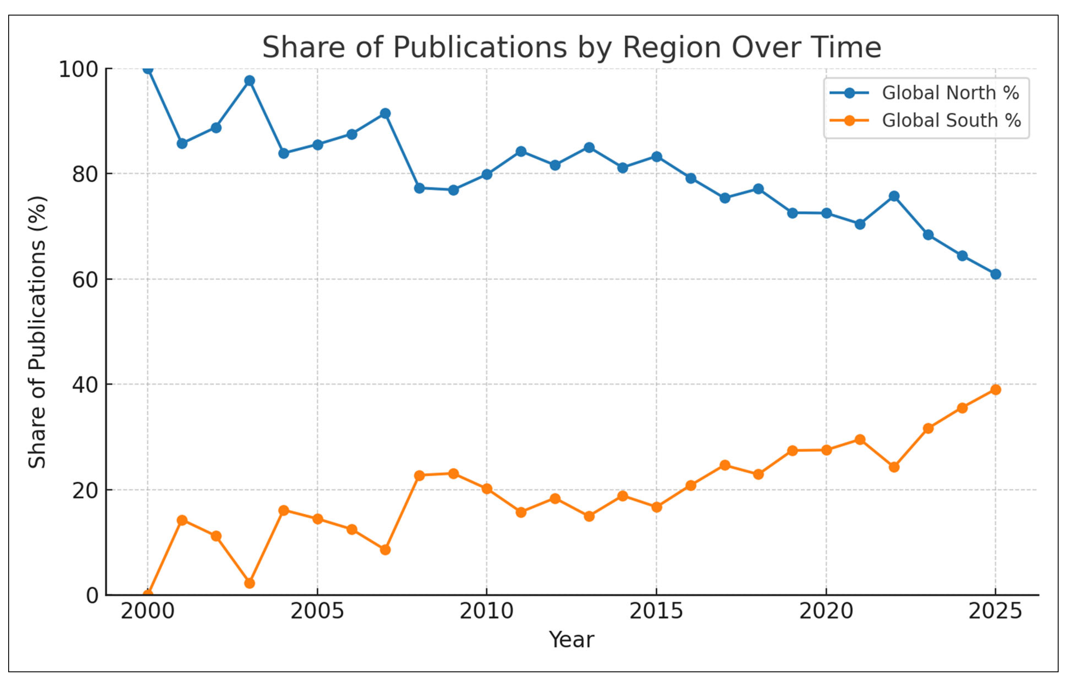 Figure 4. Global North vs. Global South publications during the period 2000–2025.