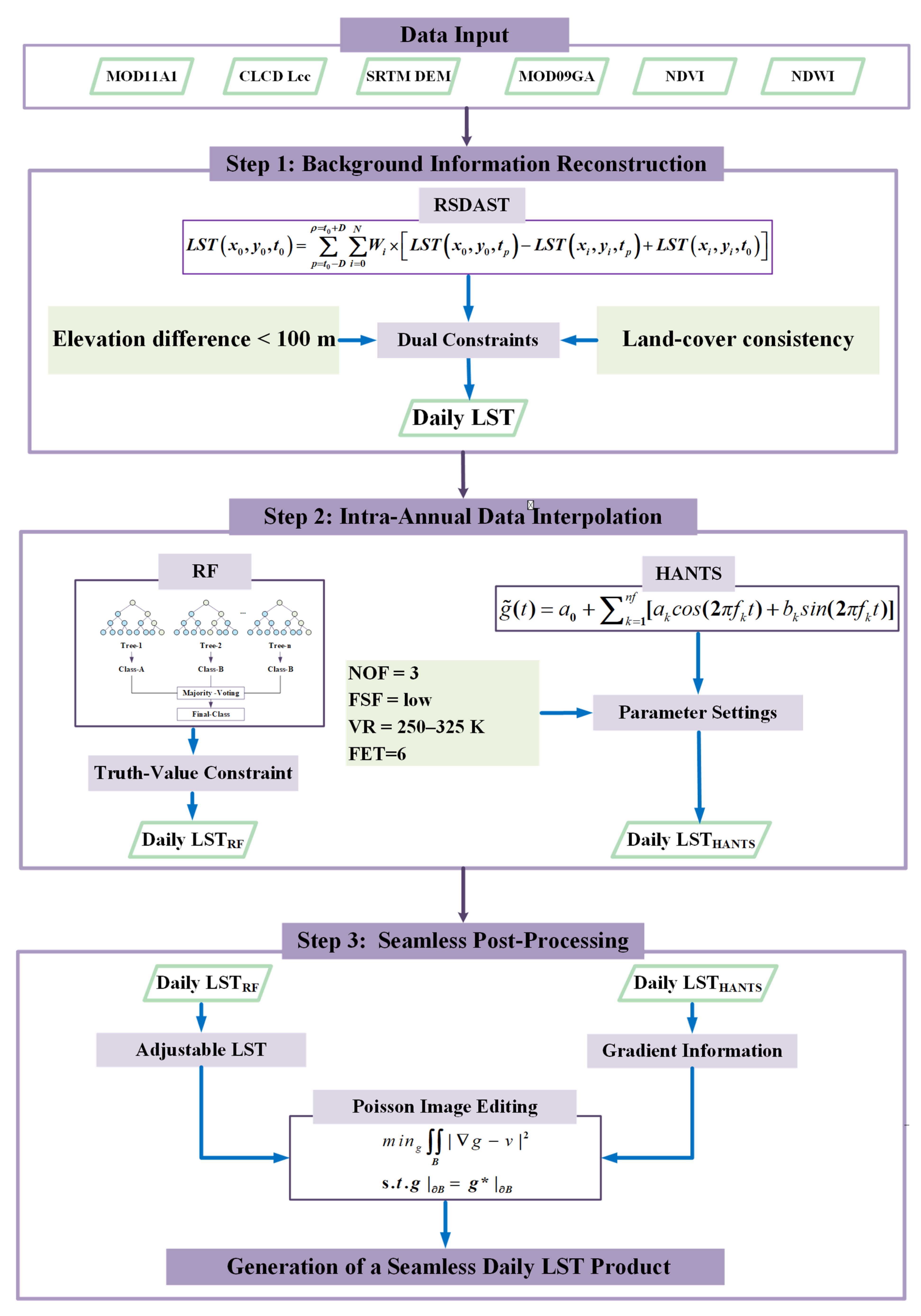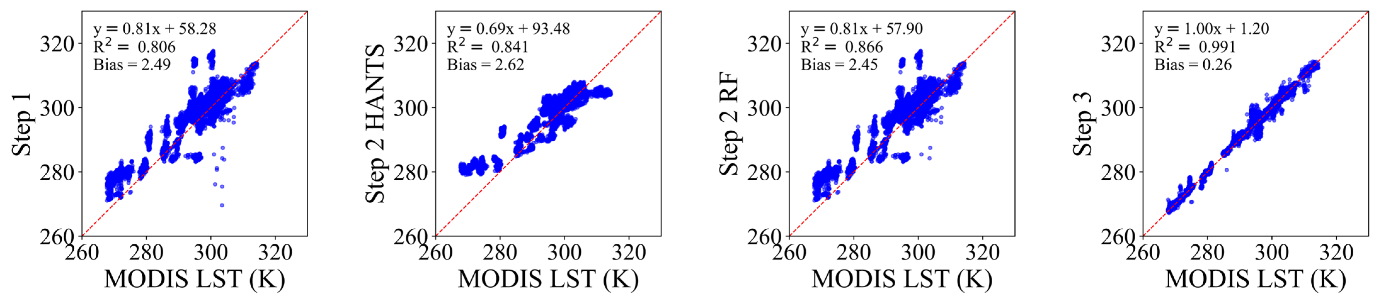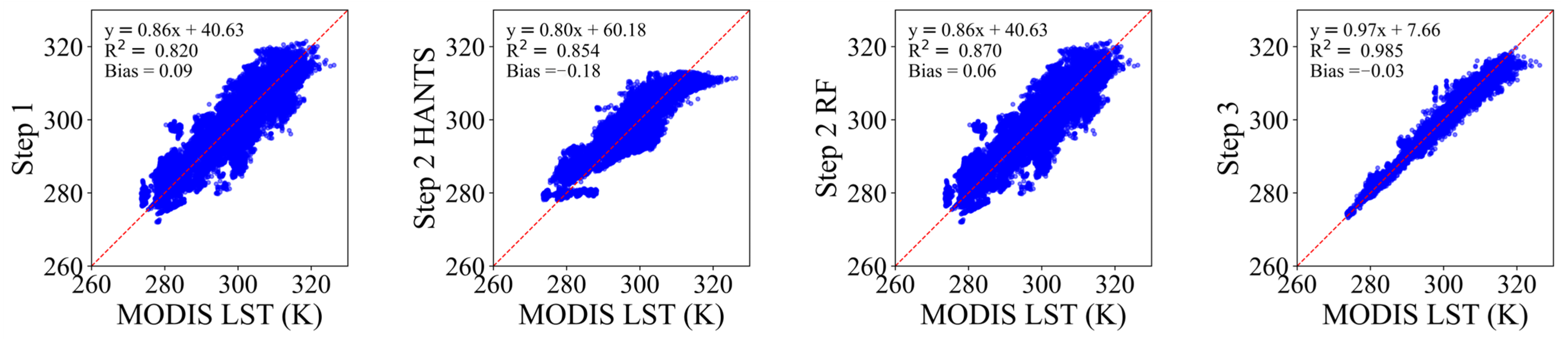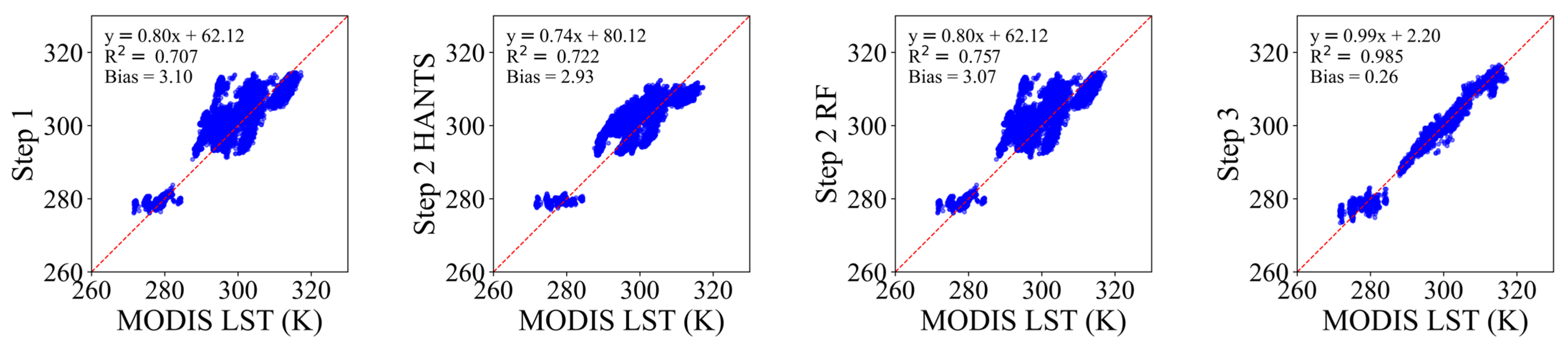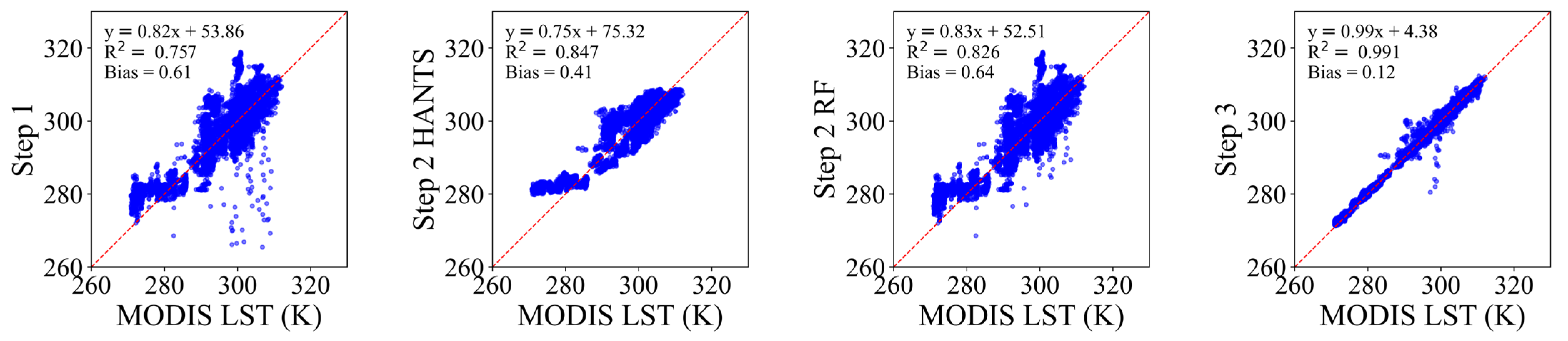 Temporal comparison of CC, Bias, and RMSE across 71 daytime LST images in the Huainan region, reconstructed using Step 1, Step 2 RF, Step 2 HANTS, and Step 3.