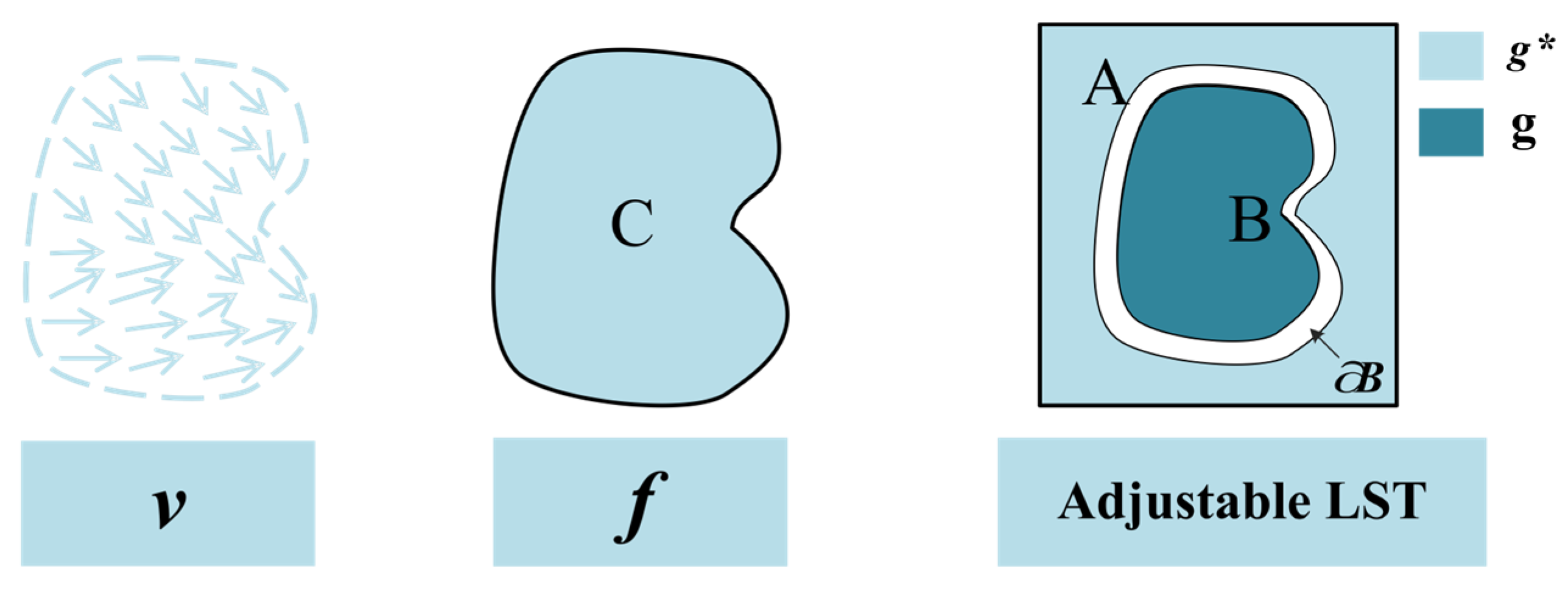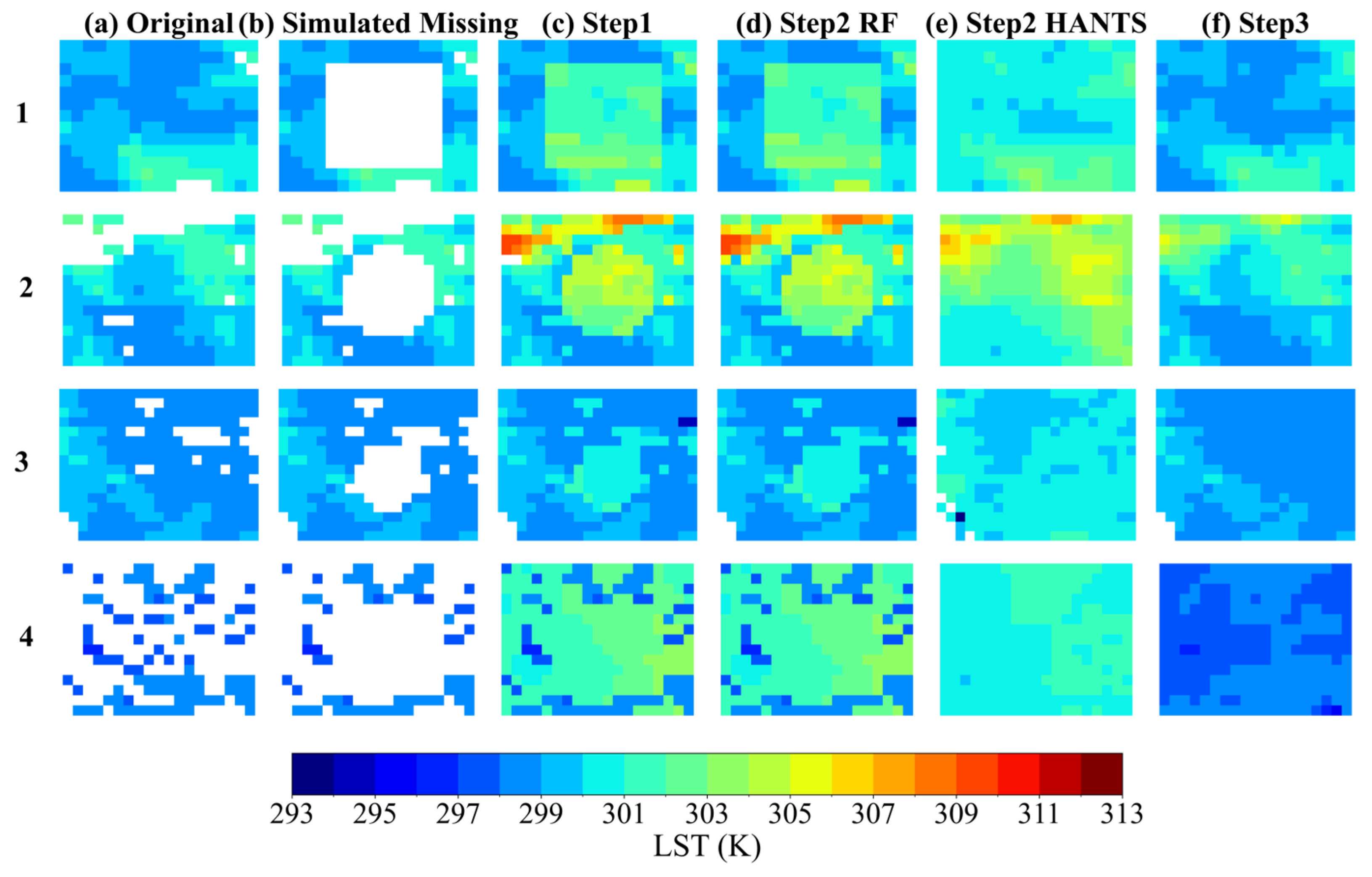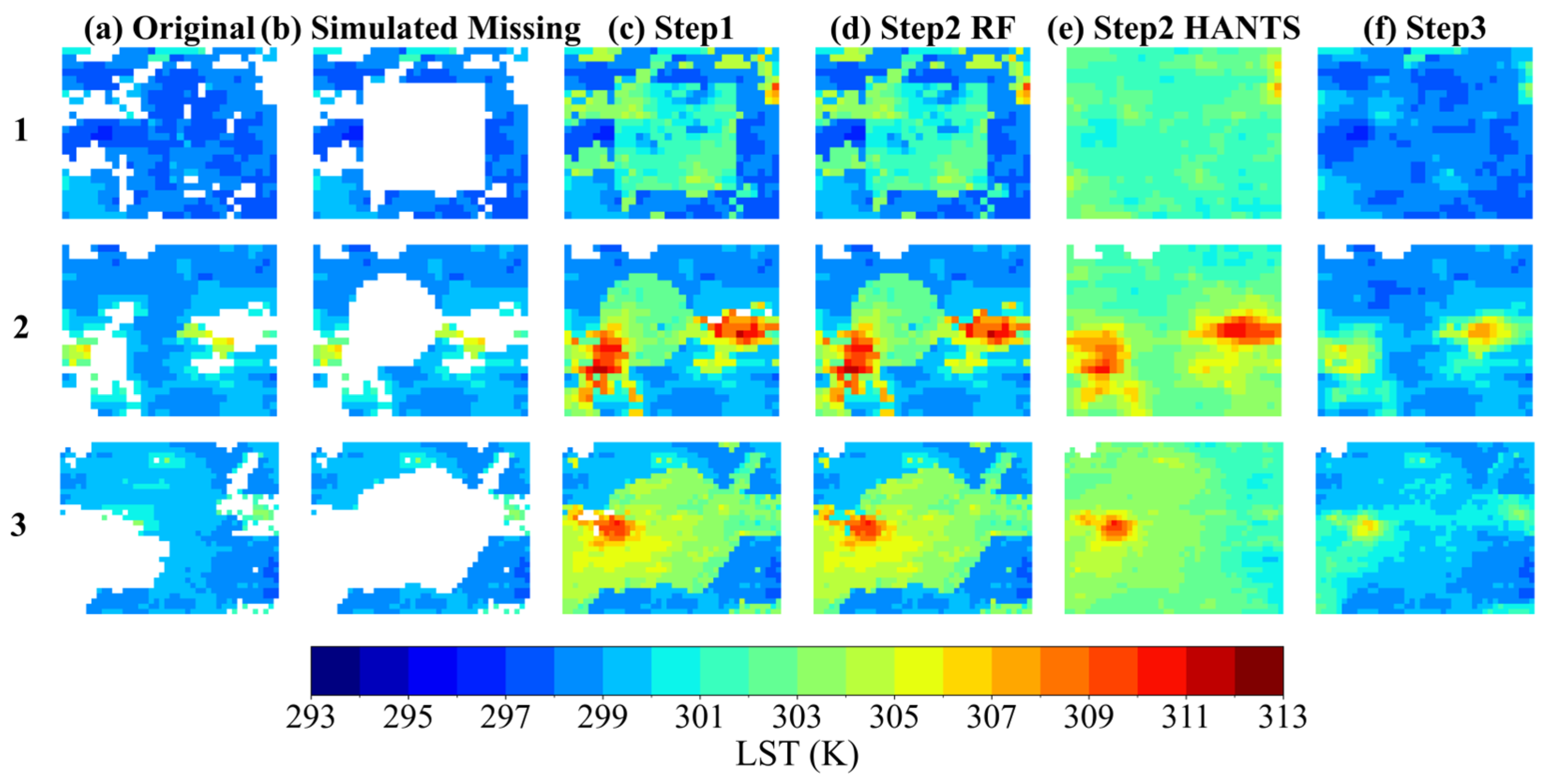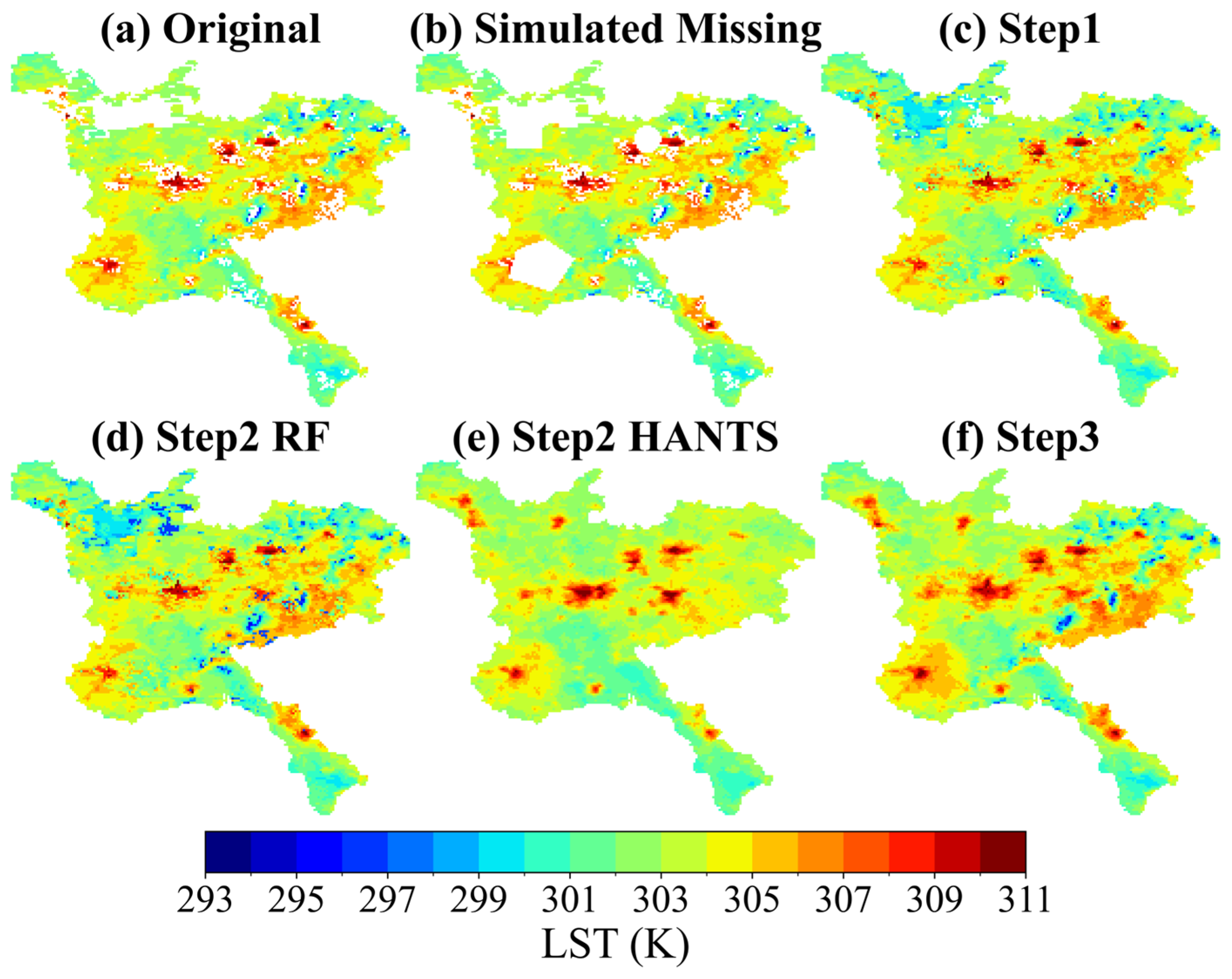 Reconstructed daily LST for 26 August 2018 (day) in the Jining region using each step of the integrated method. Simulated missing areas are represented by blank regions in rectangular, circular, and polygonal shapes. (a) Original daily LST; (b) simulated missing daily LST; (c) background-constrained reconstructed daily LST; (d) RF-reconstructed daily LST; (e) HANTS-reconstructed daily LST; (f) Poisson image reconstruction of daily LST.