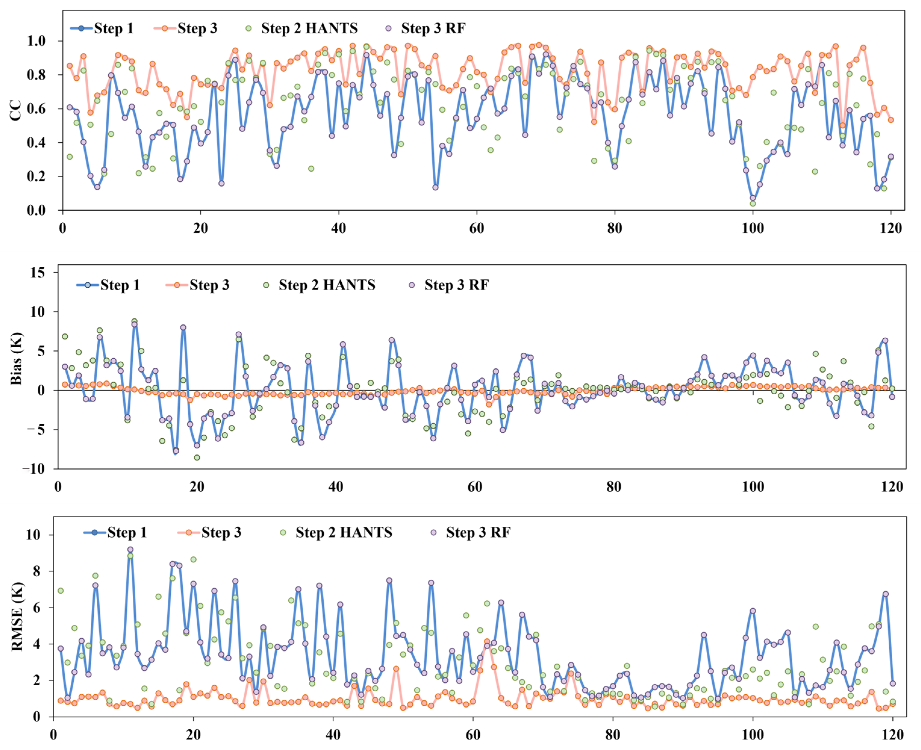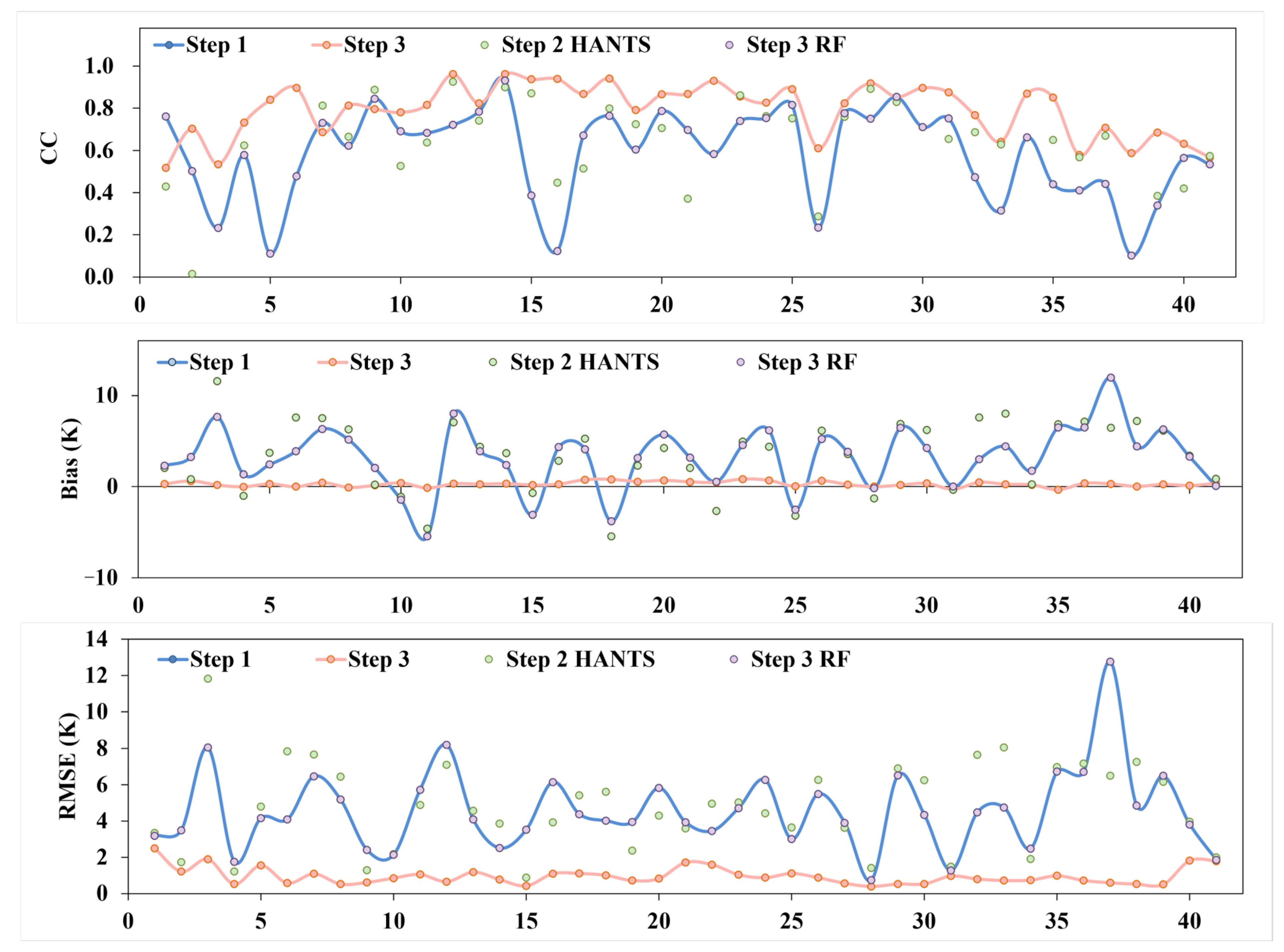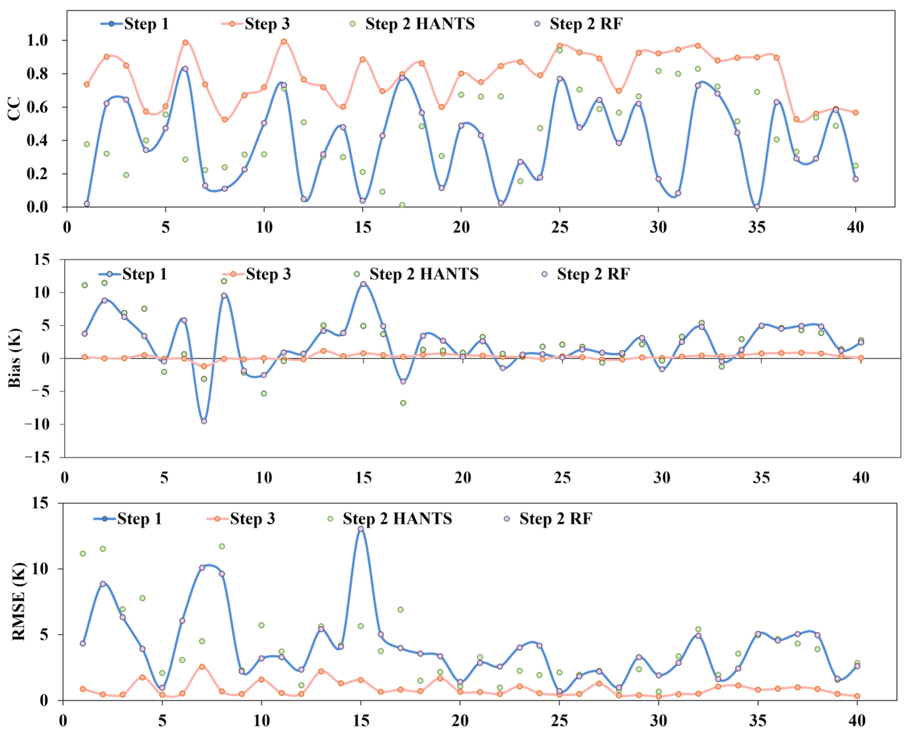 Temporal comparison of CC, Bias, and RMSE across 40 nighttime LST images in the Huainan region, reconstructed using Step 1, Step 2 RF, Step 2 HANTS, and Step 3.