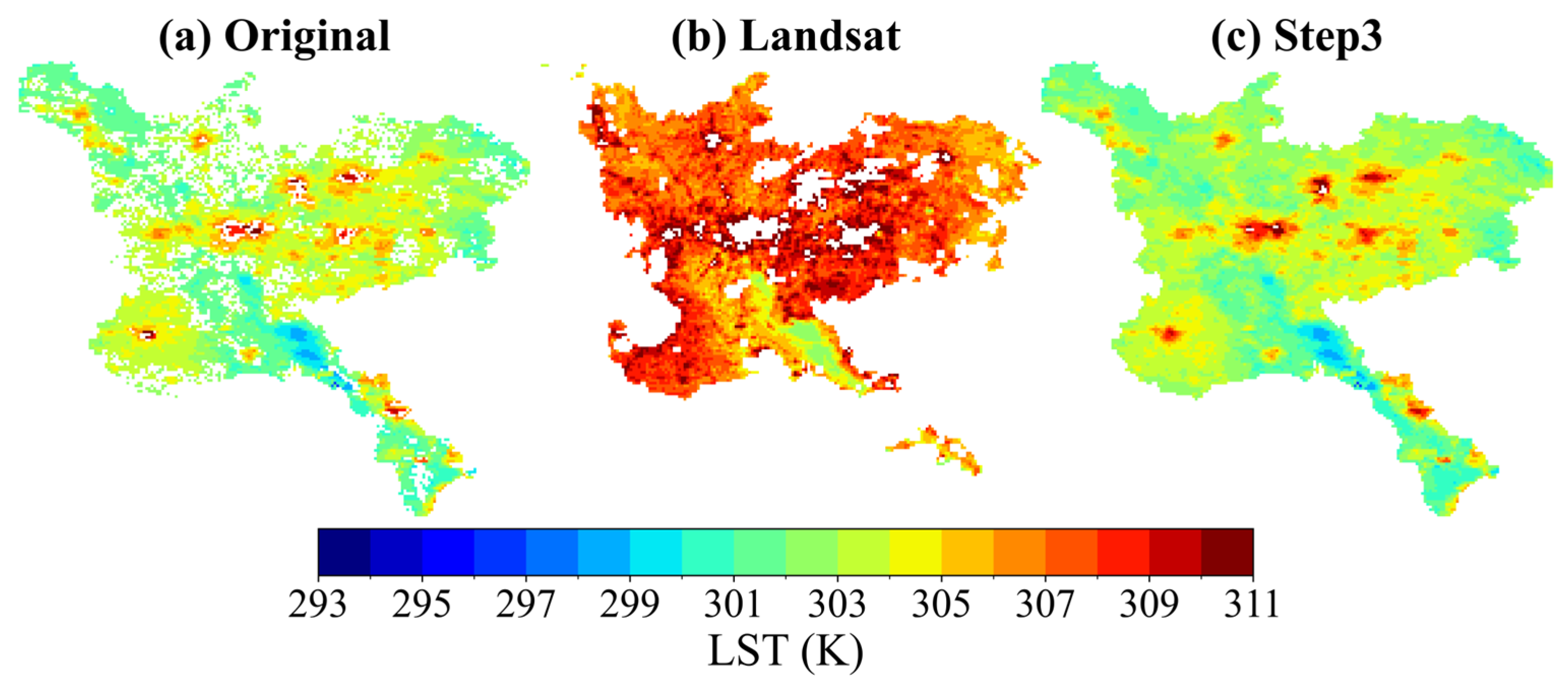 Spatial comparison between reconstructed daily LST and original MODIS daily LST with Landsat LST for 23 August 2018, in the Jining region. (a) Original daily LST; (b) Landsat daily LST; (c) Step 3-reconstructed daily LST.