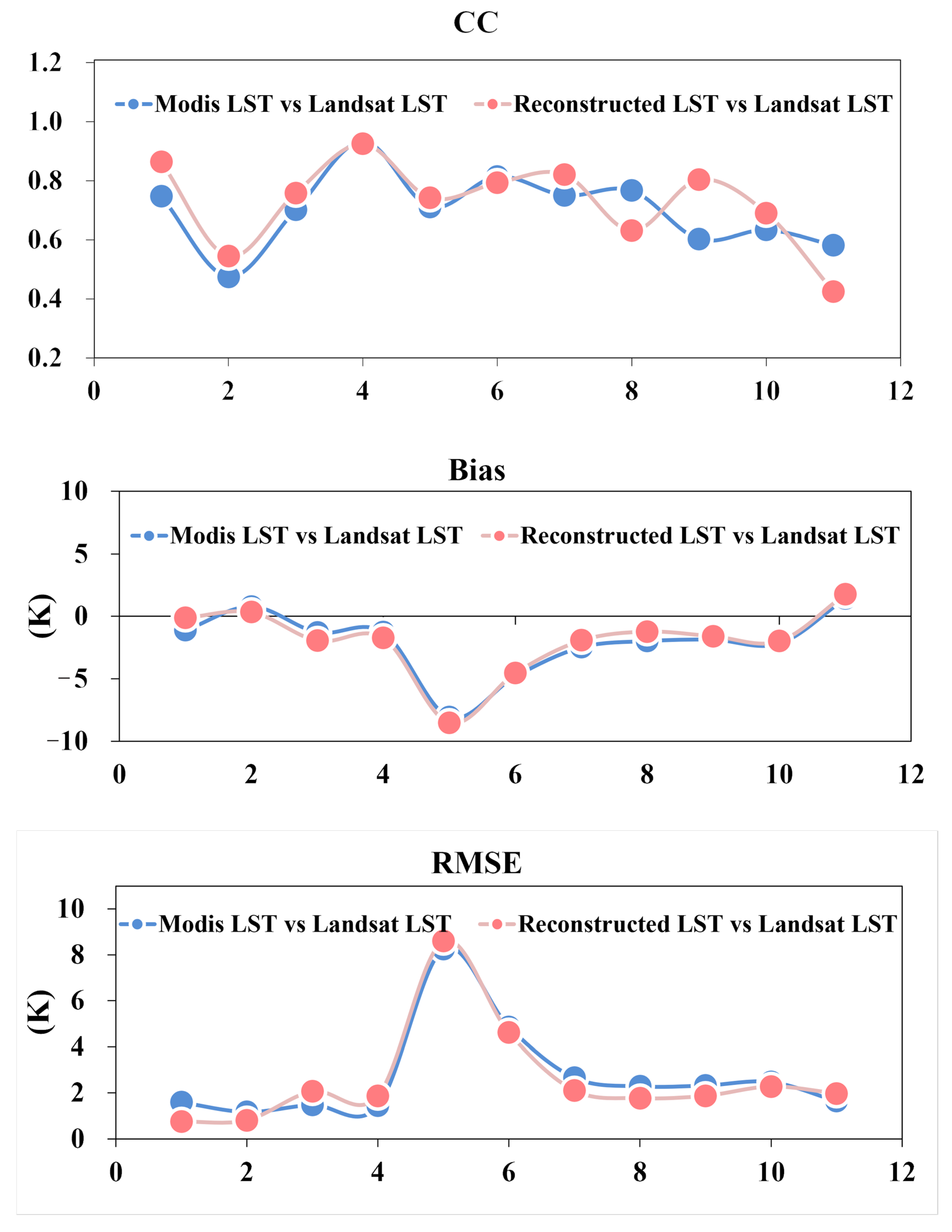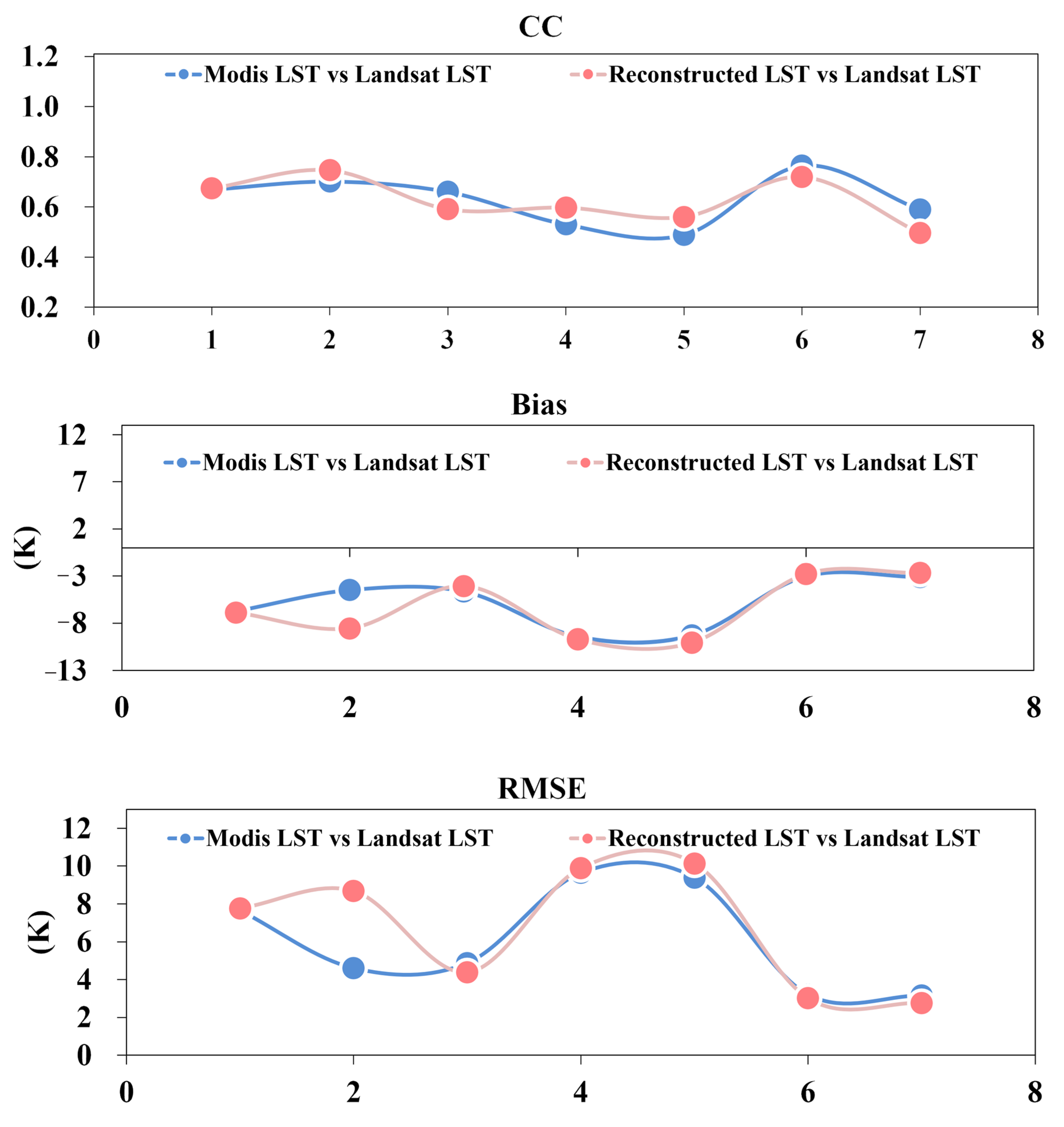 Comparison curves of three evaluation metrics (CC, Bias, and RMSE) for seven selected daytime images in the Huainan region. Results are shown for both original MODIS LST vs. Landsat LST and Step 3-reconstructed LST vs. Landsat LST.