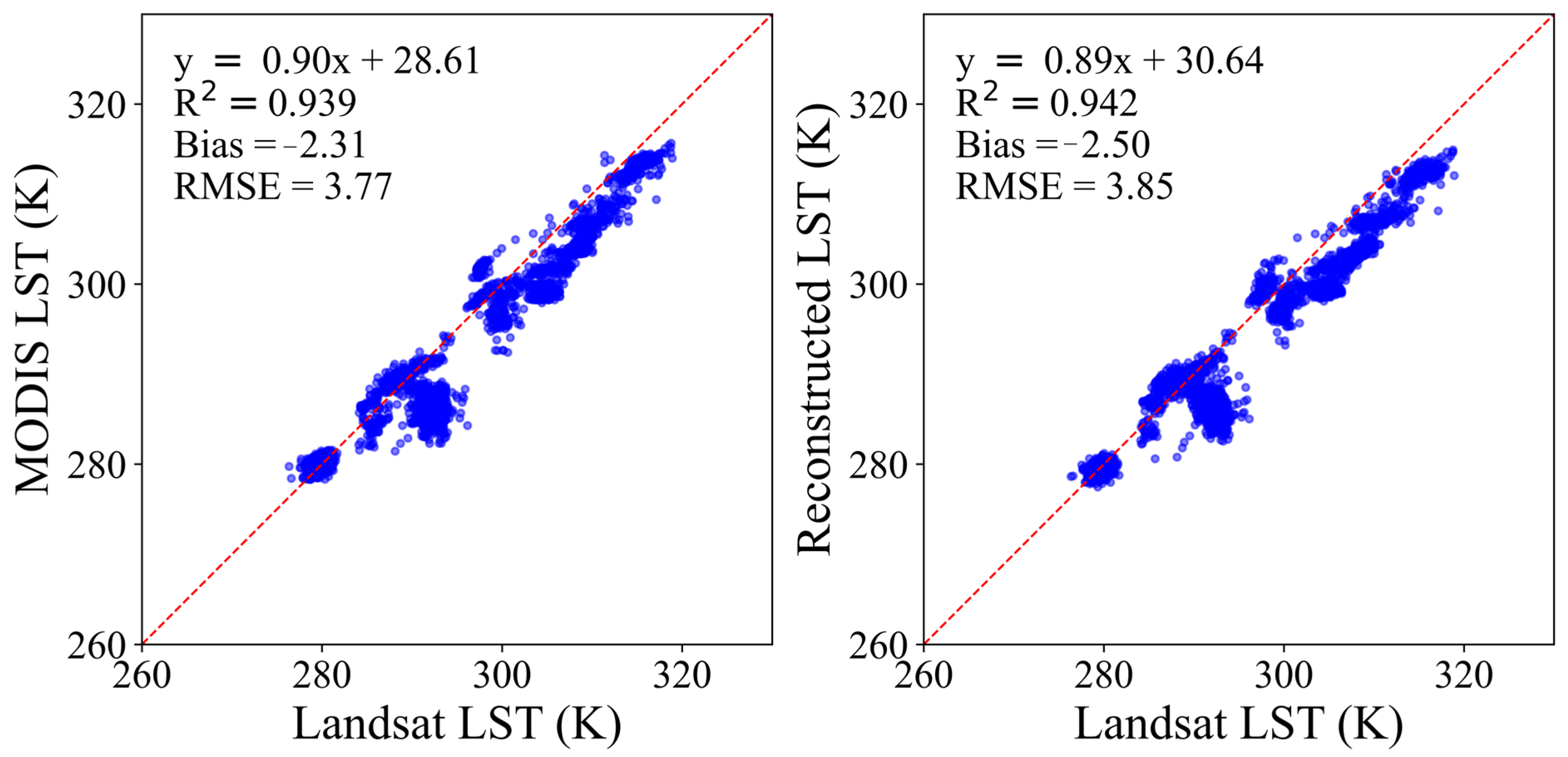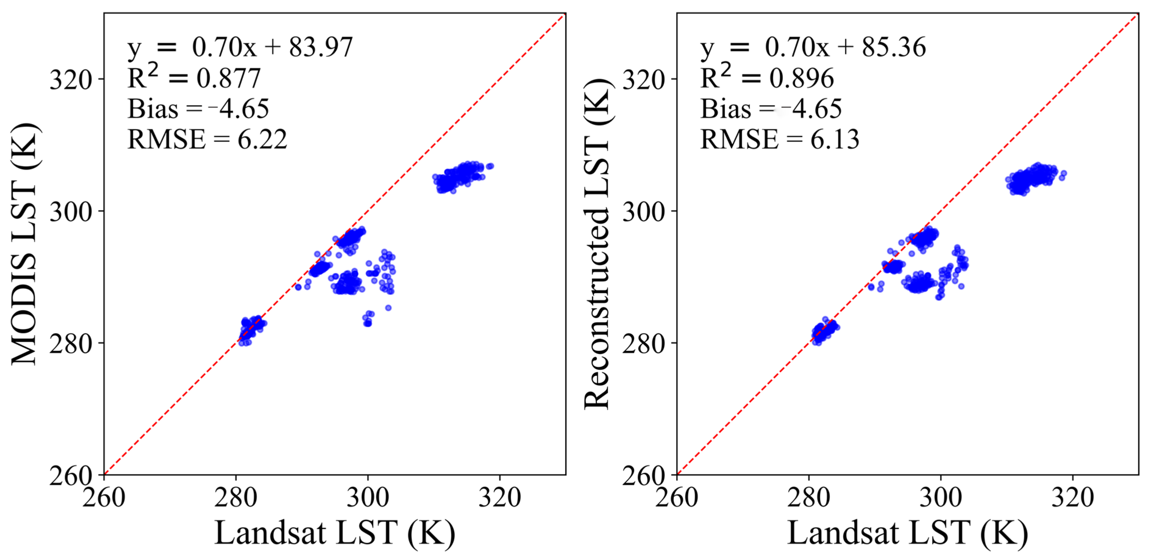 Scatter plot comparisons between reconstructed and original MODIS LST values and Landsat LST for all simulated missing pixels across eleven selected images in the Jining region.