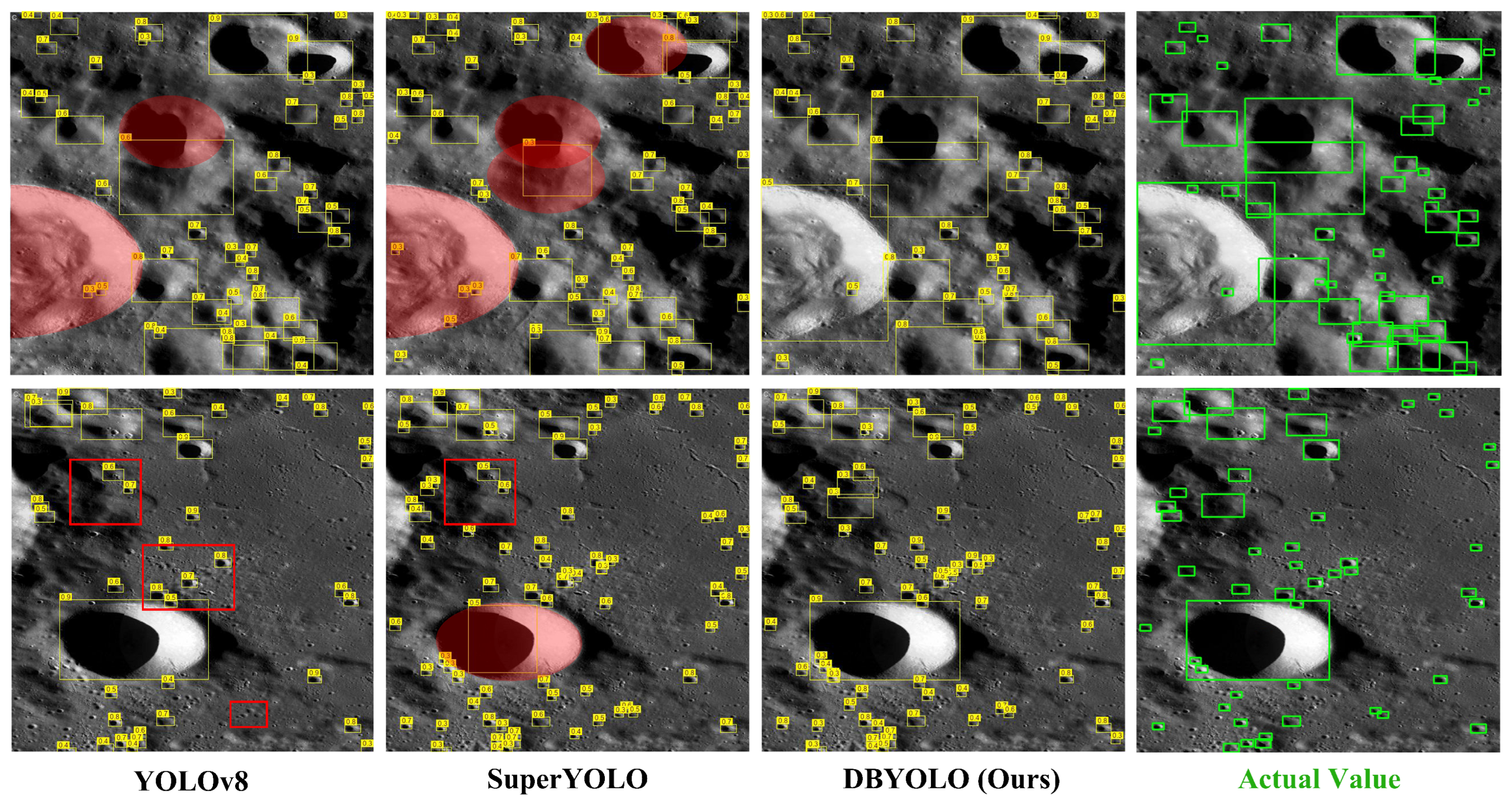 - Optimization for Small Crater Detection: By incorporating a local feature fusion module, a multi-scale feature fusion framework, and a local attention pyramid module, the feature representation of small targets is enhanced, improving the detection accuracy of small lunar craters [53].