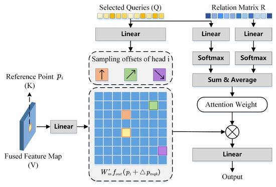 Relation-Embedded Self-Attention. In order to better integrate geometric relation information and reduce the impact on computational complexity, we improve the deformable attention mechanism. Given the feature map and a geometric relation matrix R, the relation-embedded self-attention calculation process is shown in Figure 4 and can be represented as follows: