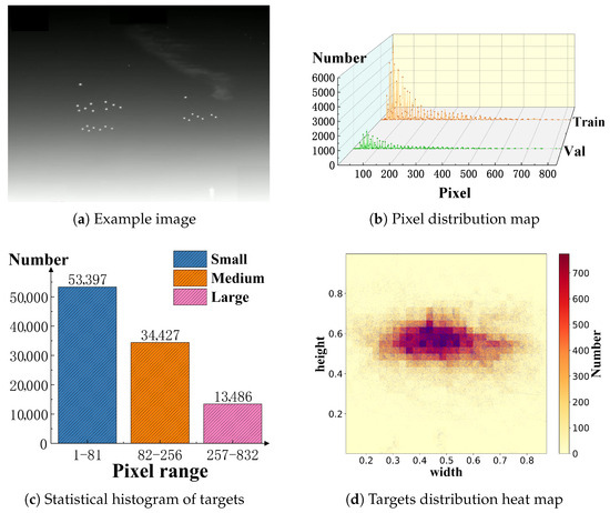 Datasets. We conducted extensive experiments on the self-constructed UAV Swarm Dataset (USD) and the publicly available Drone Vehicle dataset. The USD contains 7000 infrared images of low-altitude UAV swarms with a resolution of 720 × 540, capturing low-altitude UAV swarms against urban backgrounds. The data was acquired using mid-wave infrared cameras mounted on a ground-based platform, simulating real-world drone swarm operations. Data collection covered varied conditions, including time of day (day and night) and weather (clear and cloudy). To ensure diverse behavioral representation, the UAV swarms were programmed to execute multiple formations—such as linear, circular, and random patterns—along with maneuvers, including hovering, cruising, and crossing. The original video clips were converted into image sequences at 25 frames per second, with frames sampled at three-frame intervals for annotation in COCO format. The resulting infrared images encompass a wide range of scenarios, such as swarm cruising, cross-flights, and dynamic formation changes. Each image contains an average of 20–30 UAV targets. The images in the USD can suitably reflect the three challenges associated with the infrared UAV swarm detection mentioned in the first section; an example image and related statistical analysis are shown in Figure 5a and Table 1. The allocation of target areas and the statistical analysis of targets categorized by size are illustrated in Figure 5b,c, respectively. The distribution of UAV targets in the USD are shown in Figure 5d. The heat map indicates the number of UAV sightings in the same area, and each blue point indicates an UAV target.