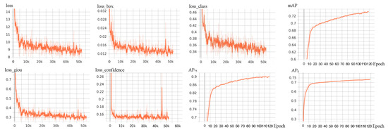 The criterion for determining a true positive is that the C-IoU of the prediction bounding box and the ground truth should be greater than the threshold of 0.5. The average AP for each class is given as mAP, while the average accuracy mAP is obtained from thresholds in the range 0.5:0.95. In addition, the computational and real-time performance are evaluated based on the number of giga-floating-point operations per second (GFLOPs) and frames processed per second (FPS).