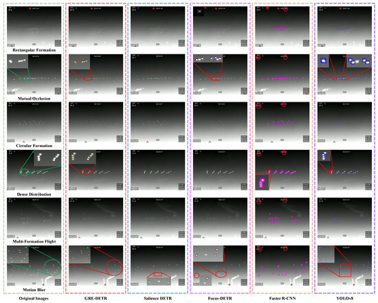 Visualization results for USD. We selected six representative images from the test set to visualize the detection performance covering formation changes, dense distribution, mutual occlusion, multi-cluster flights, motion blur, and different formation shape scenes. In Figure 9, we visualize the attention results of the GM-DETR and find that it can effectively locate the foreground area and distinguish targets from background. Although the GM-DETR is also affected by watermarks and the smoke, the GM-DETR is able to eliminate their interference in the query refinement and decoding stages from the final detection results, which are shown in Figure 10. In Figure 11, we visualize the confidence values of the queries selected by the BBS module. Since only queries with high confidence were selected, there are red dots but no blue dots in the subgraphs. The visualization results demonstrate that the Boundary–Center Balance Sampling module enhances the relevance of the selected query to the target by guiding the selection of queries, which makes the GM-DETR focus on the boundary and center regions.