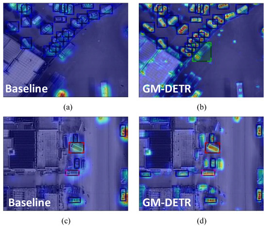 (a–d) Attention heat maps of GM-DETR and baseline. Baseline model indicates the Salience DETR.