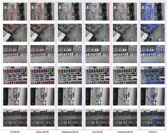 To better validate the effectiveness of the GM-DETR, we compared the performance of the GM-DETR model with models that have achieved the cutting-edge performance in recent years under the same experimental settings, namely, Faster R-CNN [29], RetinaNet [56], YOLOv5 [57], YOLOv6 [58], YOLOv7 [26], YOLOv8 [27], YOLOv10 [28], Deformable DETR [37], Conditional DETR [38], Anchor DETR [59], DAB-DETR [39], Dn-DETR [45], Dino [40], Dino-eva-01 [60], Focus-DETR [32], Co-DETR [49], and Salience DETR [44]. The evaluation results on the USD and Drone Vehicle are shown in Table 2 and Table 3. The GM-DETR achieves good performance on both datasets.