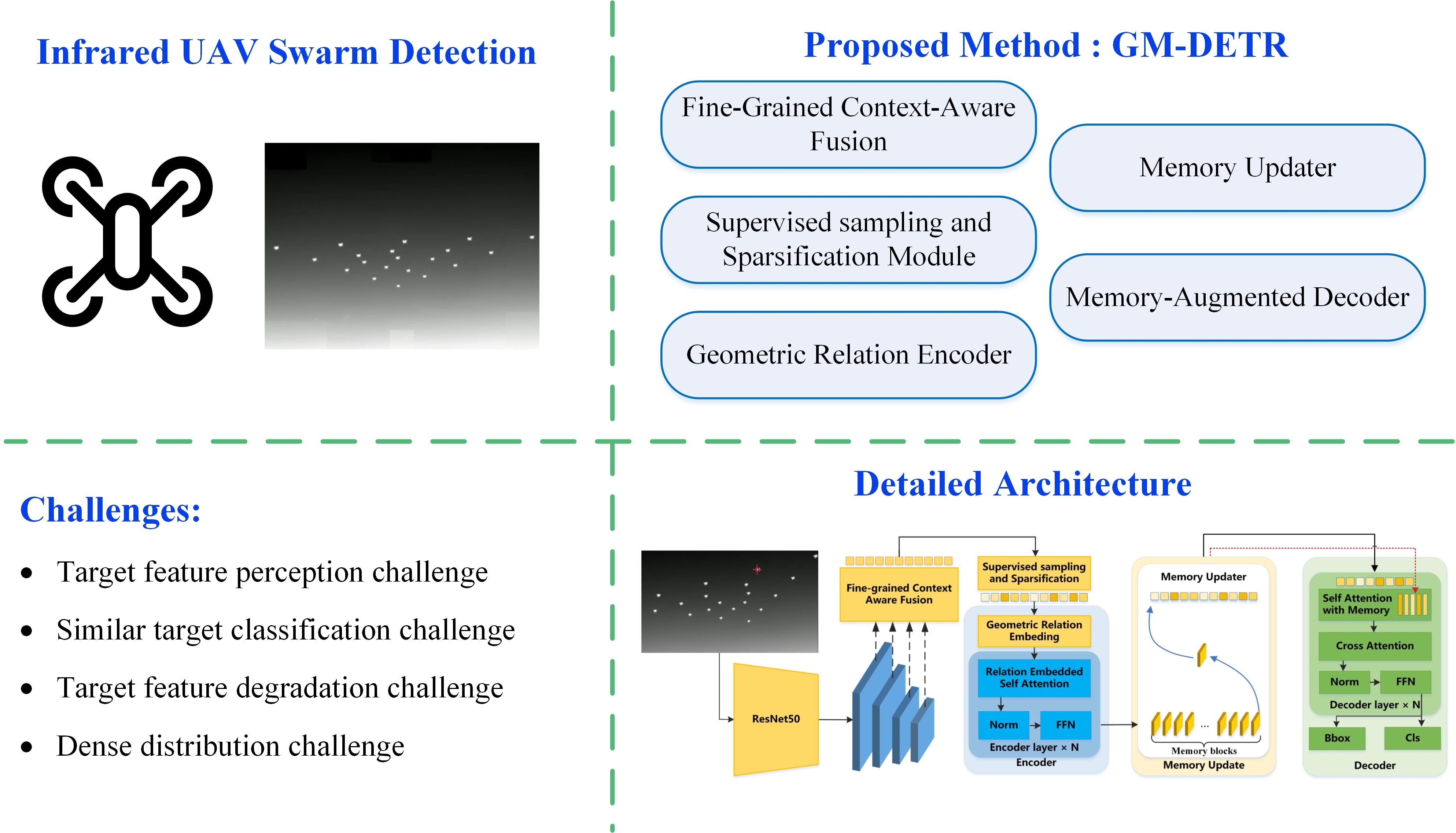 compared to the second-best method, the Salience DETR, which demonstrates the effectiveness of the GM-DETR in the infrared detection of small UAV targets. All methods were trained for 120 epochs. All employ ResNet50 as the backbone, except for Dino-eva-01, which uses EVA [