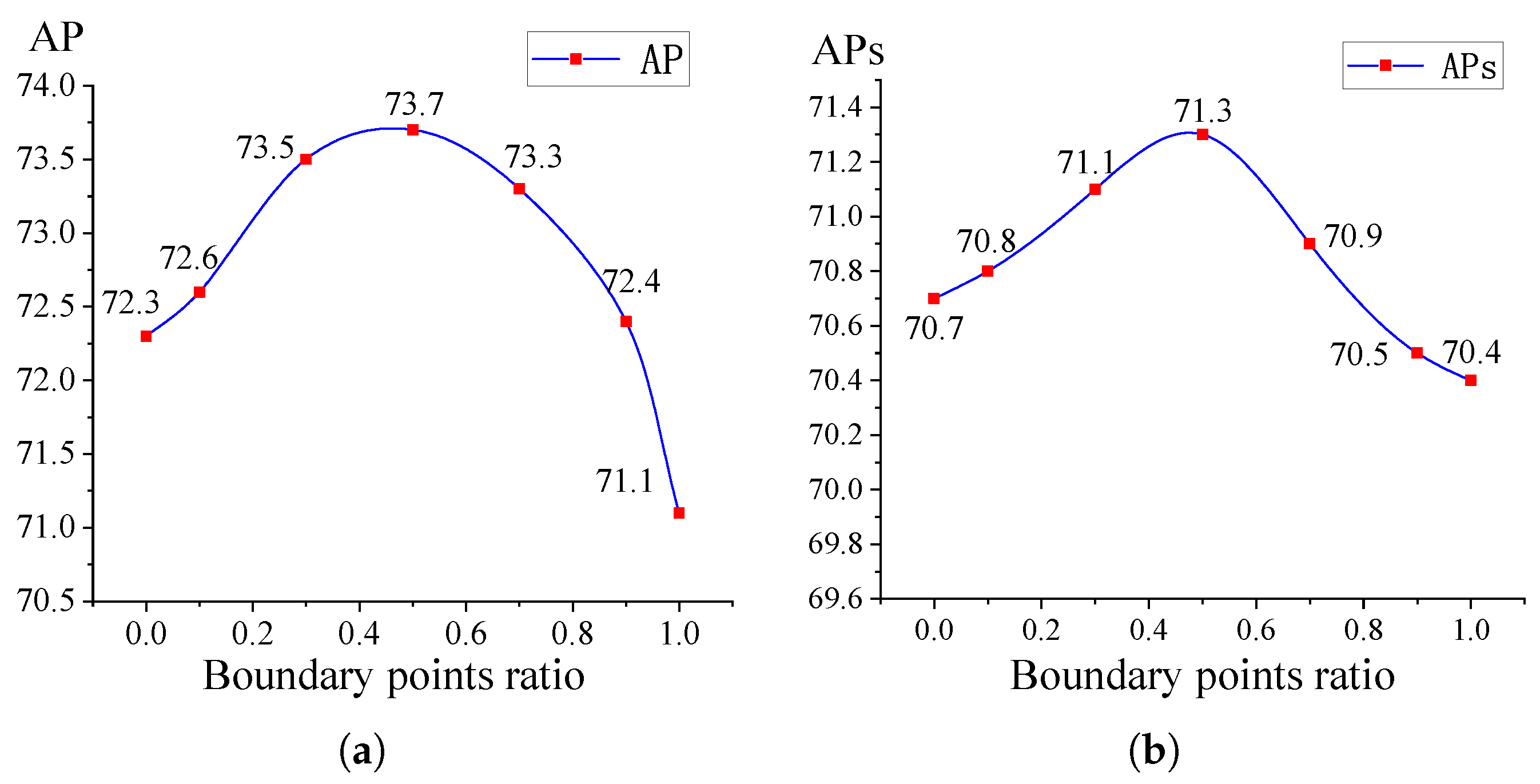 Ablation study of the boundary points ratio. To evaluate the influence of the boundary points ratio, a hyperparameter, on the model performance, we designed a detailed ablation experiment. This parameter plays a critical role in the model’s capacity to perceive and leverage edge features of faint and small targets. We performed extensive comparative experiments on the USD across different values of this ratio, with results illustrated in