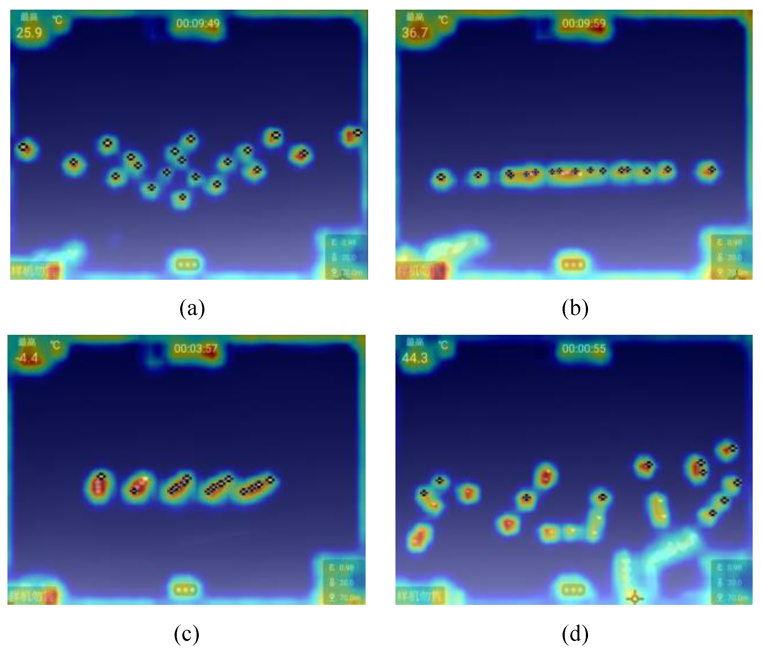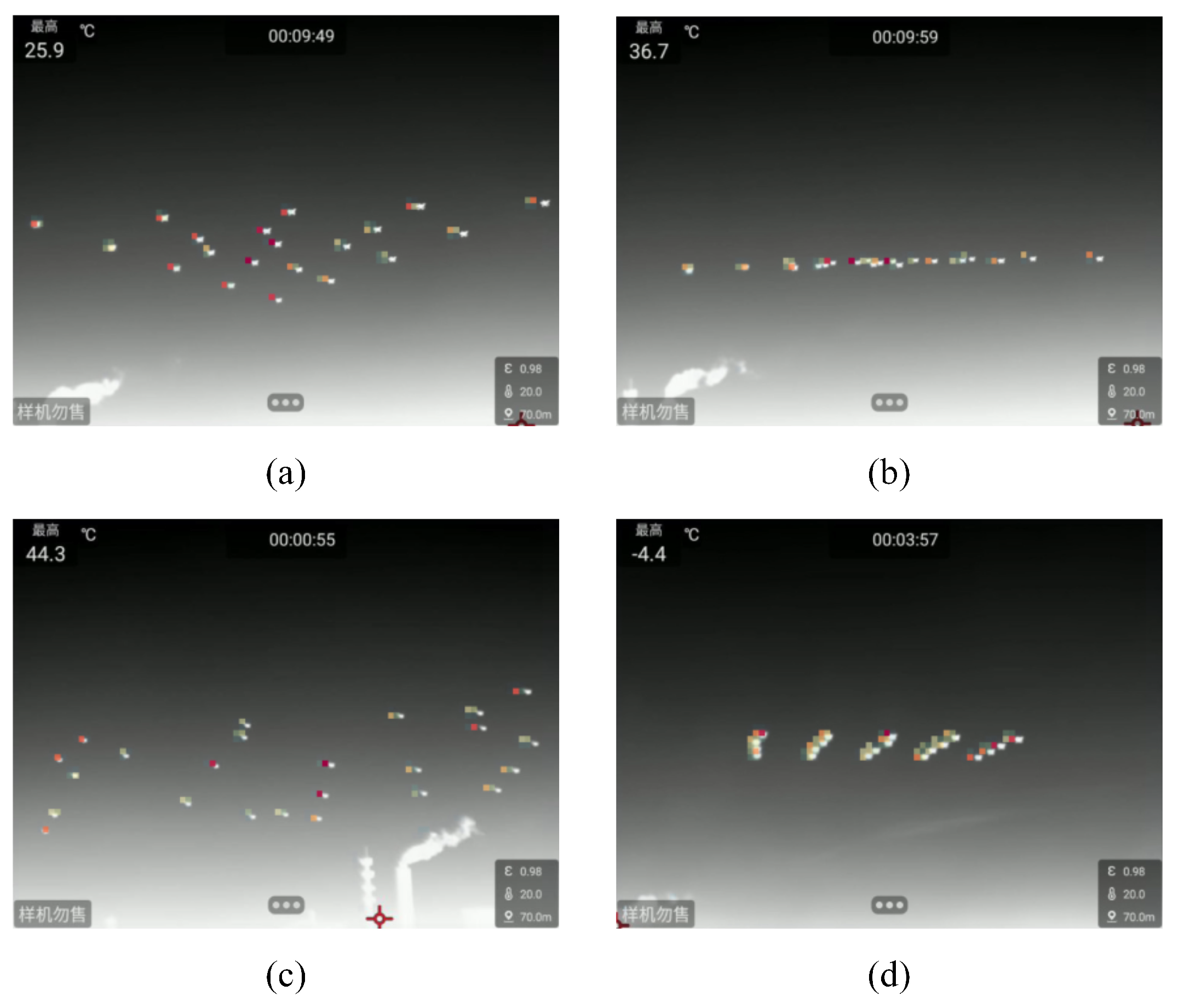 Datasets. We conducted extensive experiments on the self-constructed UAV Swarm Dataset (USD) and the publicly available Drone Vehicle dataset. The USD contains 7000 infrared images of low-altitude UAV swarms with a resolution of 720 × 540, capturing low-altitude UAV swarms against urban backgrounds. The data was acquired using mid-wave infrared cameras mounted on a ground-based platform, simulating real-world drone swarm operations. Data collection covered varied conditions, including time of day (day and night) and weather (clear and cloudy). To ensure diverse behavioral representation, the UAV swarms were programmed to execute multiple formations—such as linear, circular, and random patterns—along with maneuvers, including hovering, cruising, and crossing. The original video clips were converted into image sequences at 25 frames per second, with frames sampled at three-frame intervals for annotation in COCO format. The resulting infrared images encompass a wide range of scenarios, such as swarm cruising, cross-flights, and dynamic formation changes. Each image contains an average of 20–30 UAV targets. The images in the USD can suitably reflect the three challenges associated with the infrared UAV swarm detection mentioned in the first section; an example image and related statistical analysis are shown in