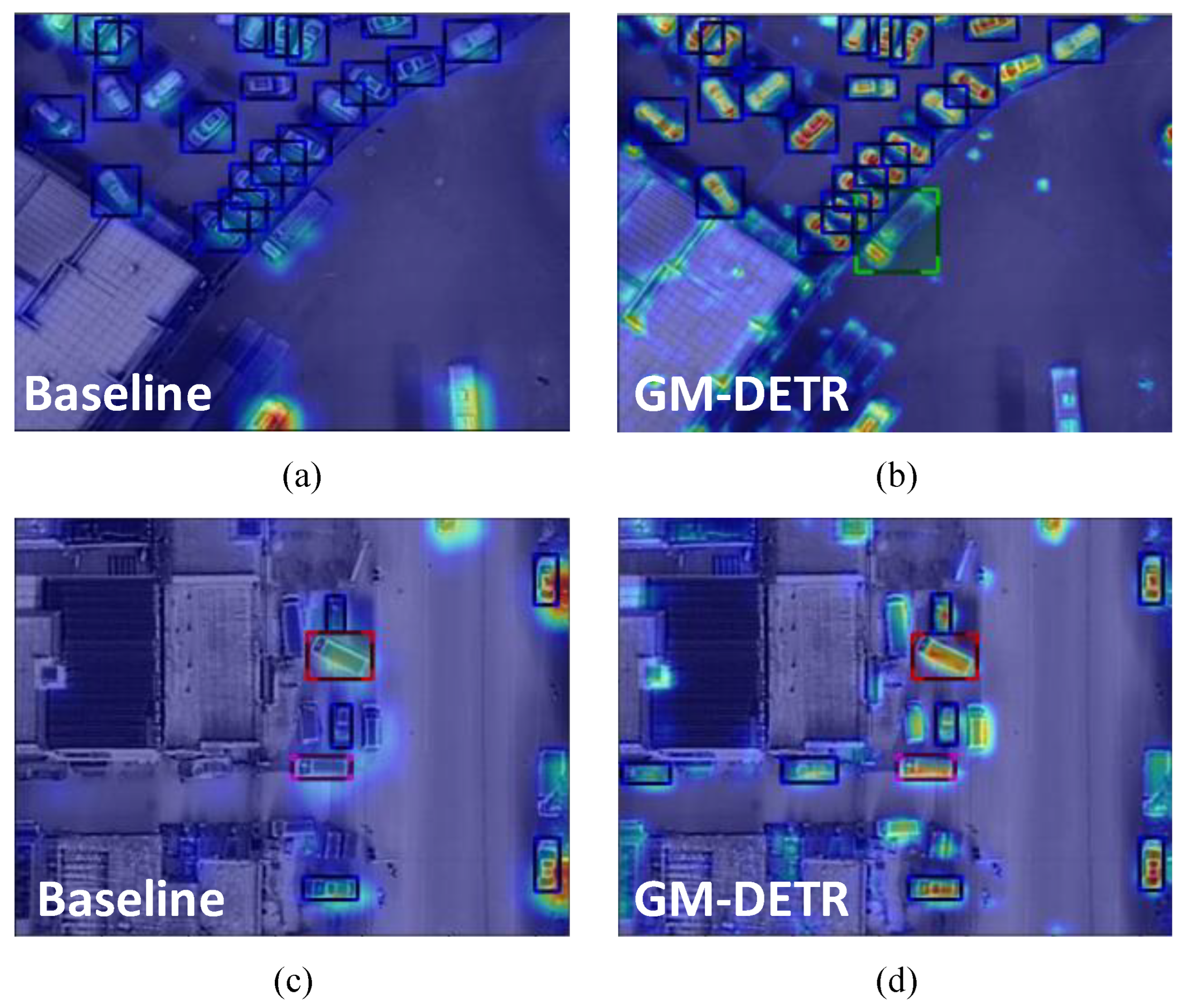 Figure 12. Comparative analysis revealed that the GM-DETR model exhibits more focused attention distribution for distinguishable parts, such as the front or rear of the vehicle, depending on the vehicle type. This phenomenon demonstrates the effectiveness of our CAS module and BBS module. In contrast, the baseline model exhibits a more focused attention response pattern relative to the target center area.