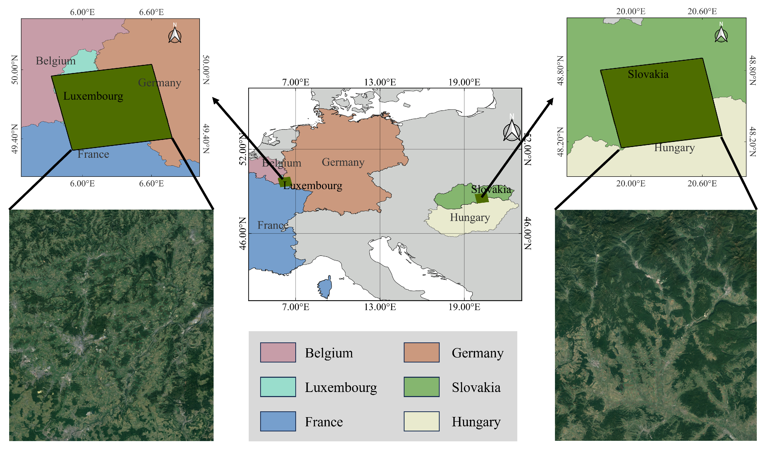 The first site is located at the intersection of Luxembourg, Germany, France, and Belgium (–N, –E), with elevations ranging from approximately 130 m to 560 m above sea level (ASL). Since most of the area lies within Luxembourg, we refer to this site as LU. The northern part of this region is predominantly hilly. The central and southern parts are relatively flat, consisting of low hills and plains. Forested areas are distributed in distinct patches with well-defined boundaries.