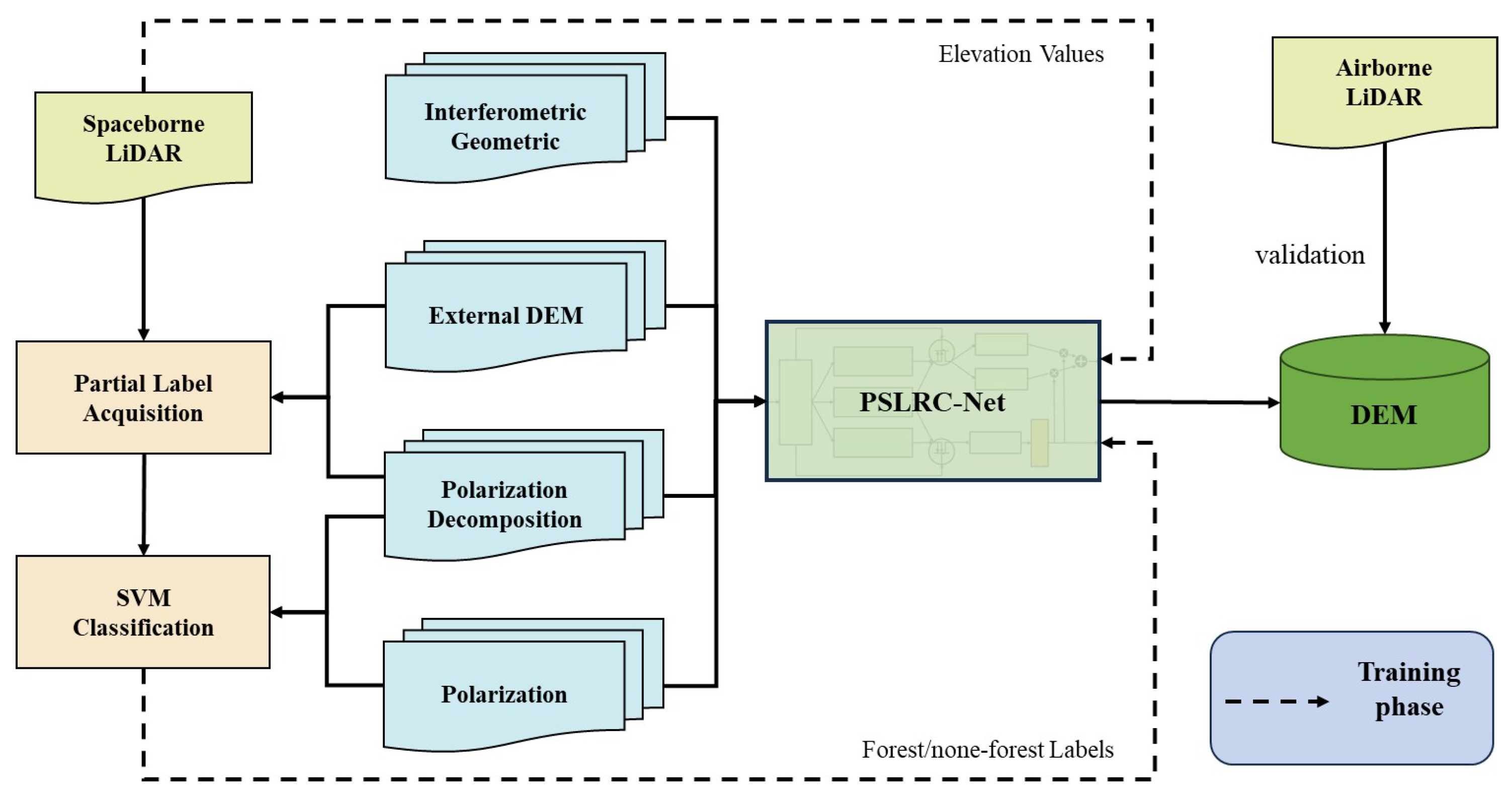 Data fusion: We propose a deep learning-based workflow for integrating spaceborne PolInSAR and sparse spaceborne LiDAR data to provide an effective solution to the challenge of high-precision reconstruction in forested areas during DEM inversion. This workflow fully exploits the complementarity of multiple data sources and combines data-driven learning methods to significantly improve the model’s predictive capability in complex terrain and topographic reconstruction.