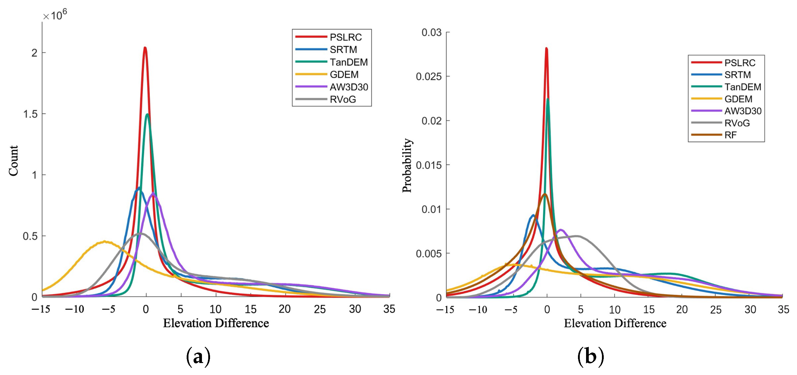 We compared the PSLRC DEM with several external DEMs, including ASTER GDEM, SRTM, AW3D30, TanDEM-X (sorted by acquisition time), and DEMs derived from the traditional RVoG model, all converted to the EGM96 [