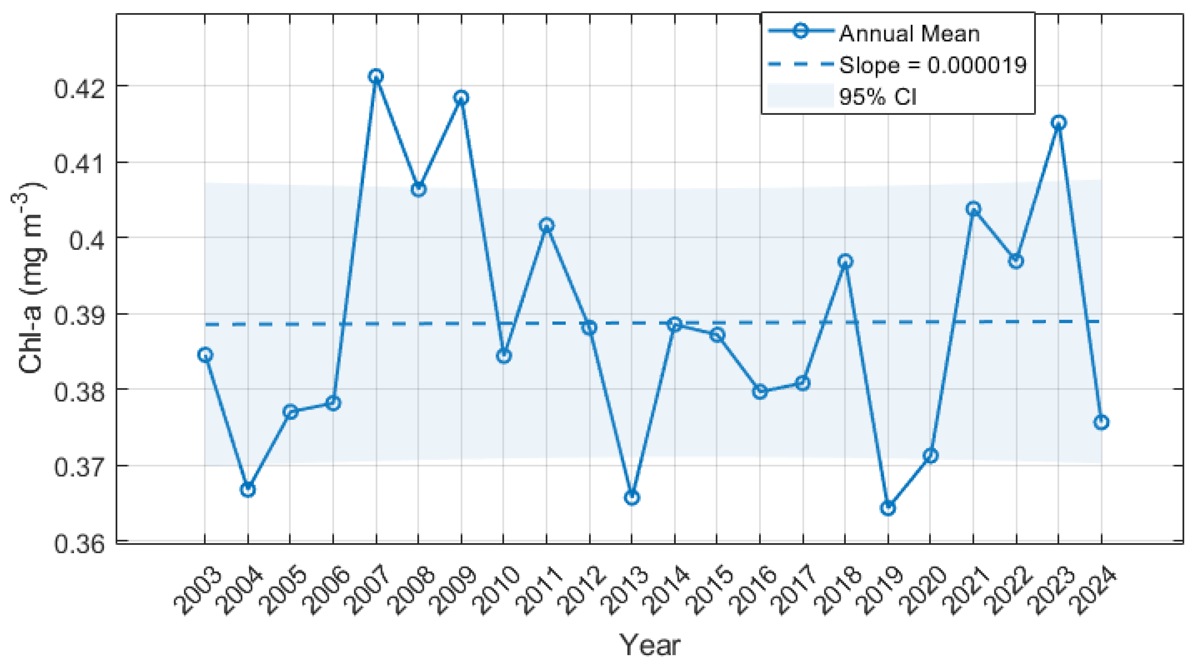 3.2.2. Interannual Variations of Chlorophyll-a Concentration