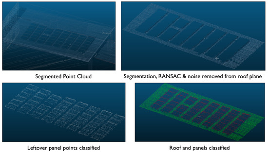 Elevated panel classification process for A block in the UniSQ dataset, RANSAC has effectively separated panels from the roof (green), which allows for classification of roof (blue) and panels (red).